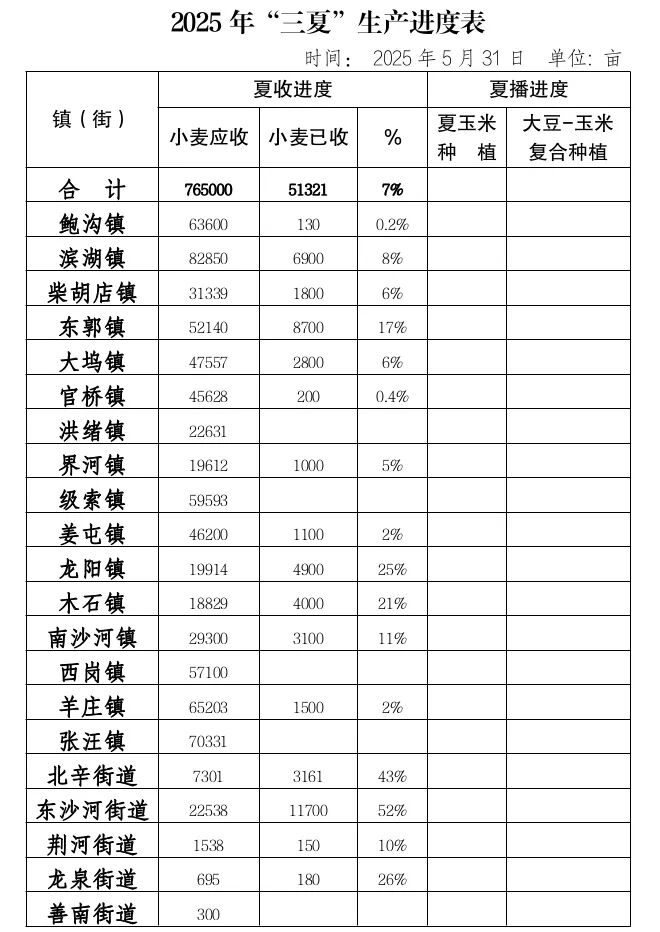 截至5月31日,全市小麦收获5.1万亩,约占应收面积的7%,基本集中在东部丘陵、山地;预计6月5日小麦进入收获高峰期。