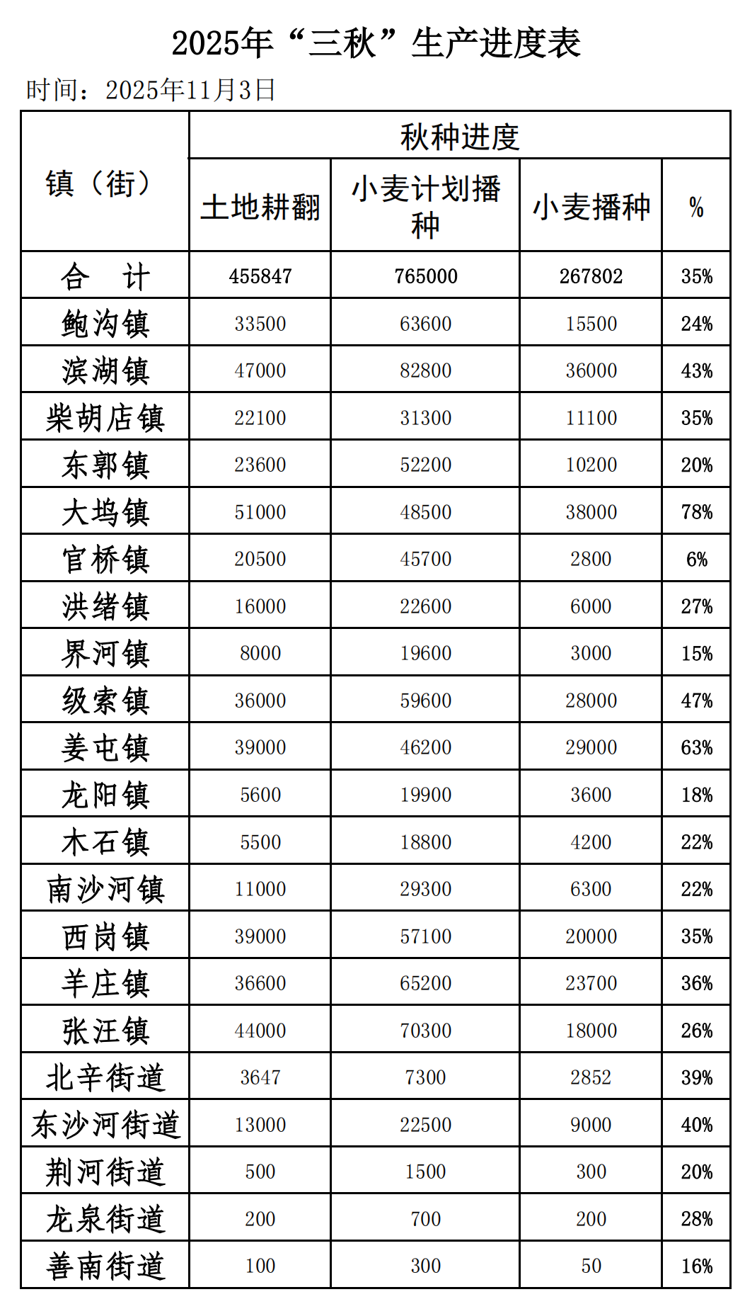近期天气晴好,土壤散墒较快,温度和墒情适宜整地播种。当前我市进入秋种高峰期,截止11月3日,土地耕翻45.6万亩,小麦播种26.8万亩,占比约35%。