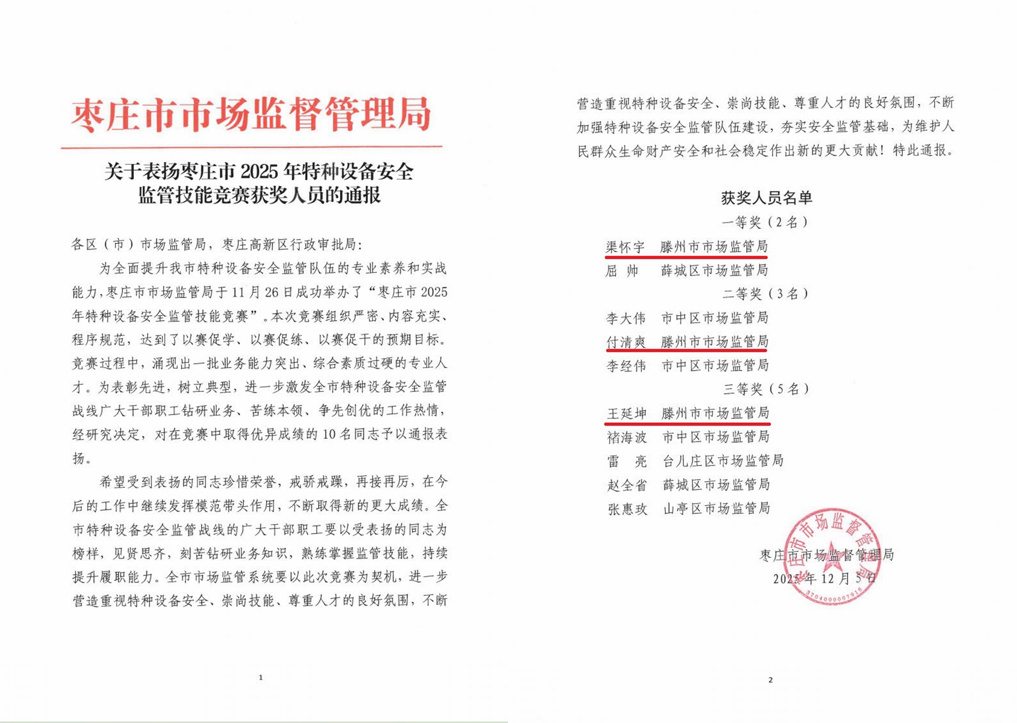 近日,在枣庄市市场监管局举办的“枣庄市2025年特种设备安全监管技能竞赛”中,滕州市市场监管局渠怀宇、付清爽、王延坤3名同志分别荣获一、二、三等奖,被枣庄市局通报表扬。