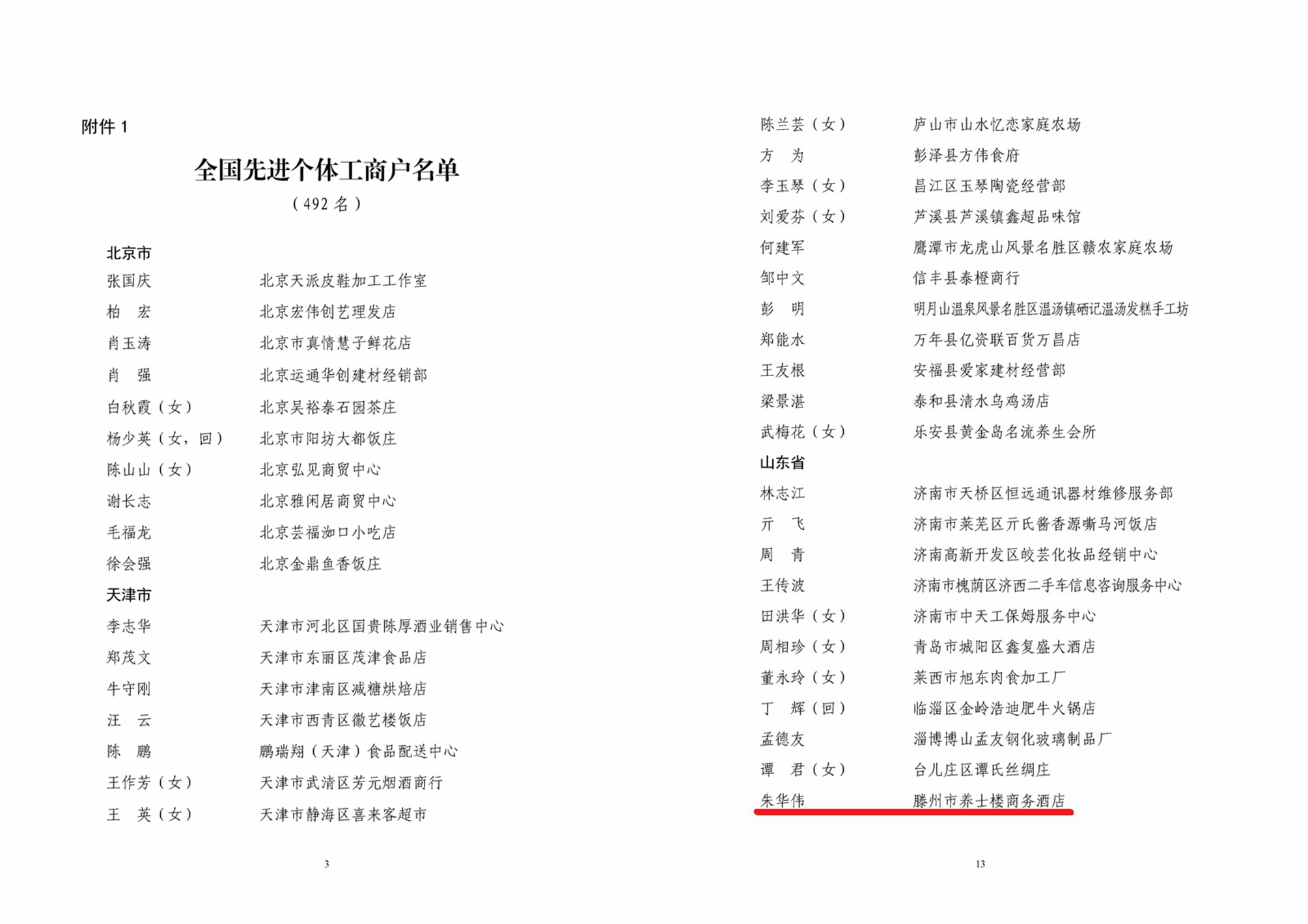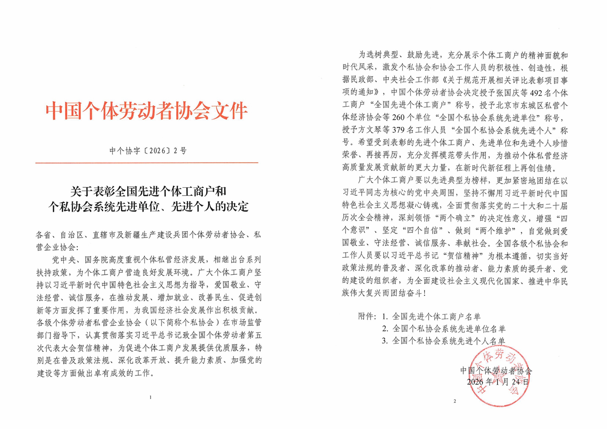 近日,中国个体劳动者协会印发《关于表彰全国先进个体工商户和个私协会系统先进单位、先进个人的决定》(中个协字〔2026〕2号),滕州市养士楼商务酒店经营者朱华伟凭借在诚信经营、就业带动、社会责任等方面的突出表现,成功获评“全国先进个体工商户”荣誉称号。