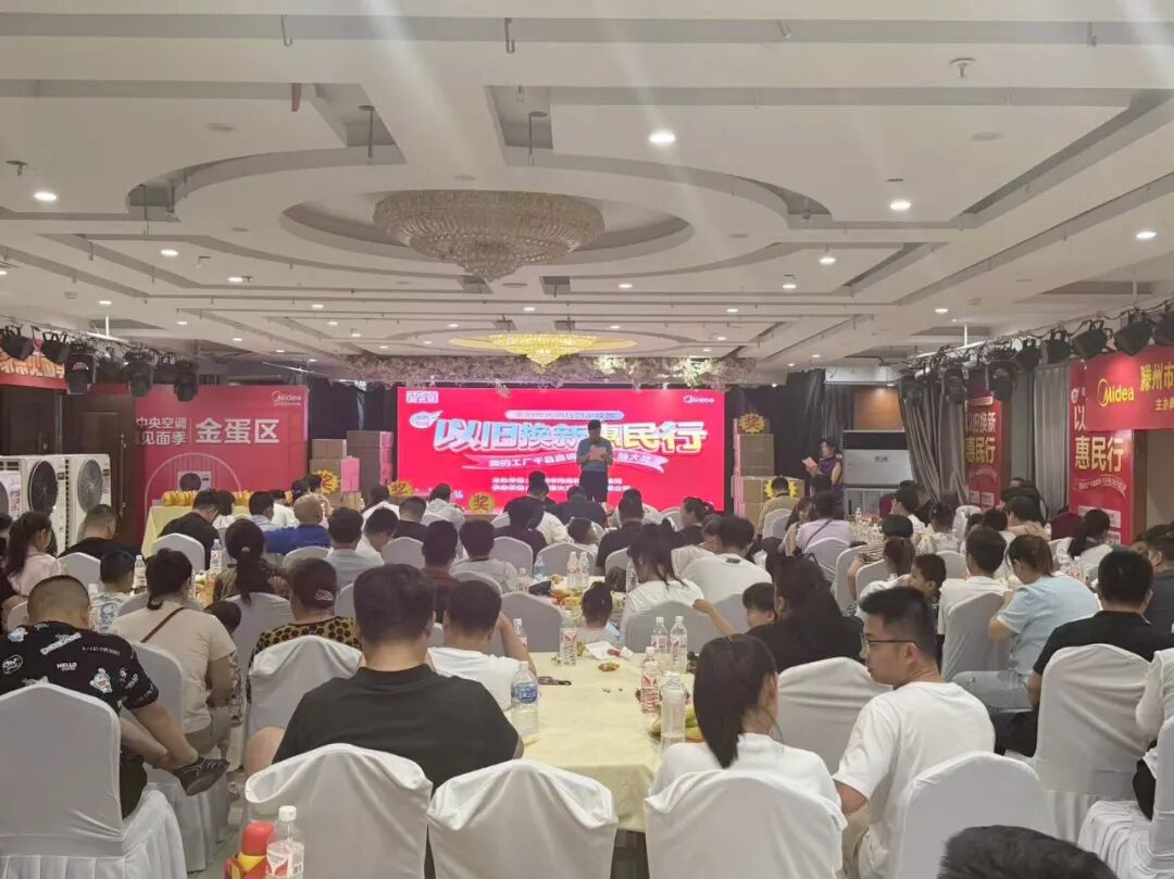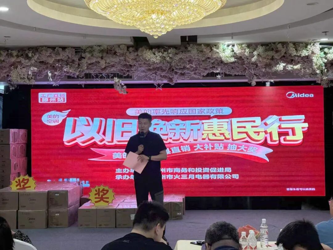 6月9日,由市商务和投资促进局主办,滕州市火三月电器有限公司承办的2024滕州市家电换新消费季暨美的电器以旧换新惠民行活动在陶然酒店举办。市商务和投资促进局党组成员、市电子商务服务中心主任张永臣,美的集团临沂运营中心市场部总经理邵立国,美的集团临沂运营中心销售部总经理李硕出席活动,200余名美的电器用户参加活动。