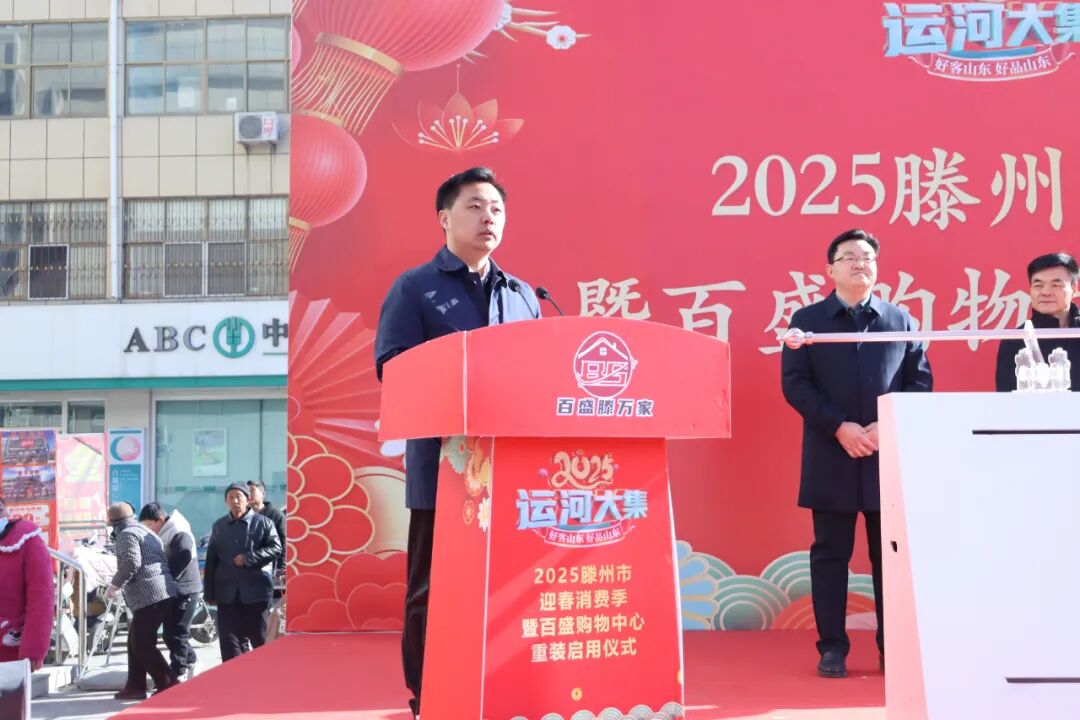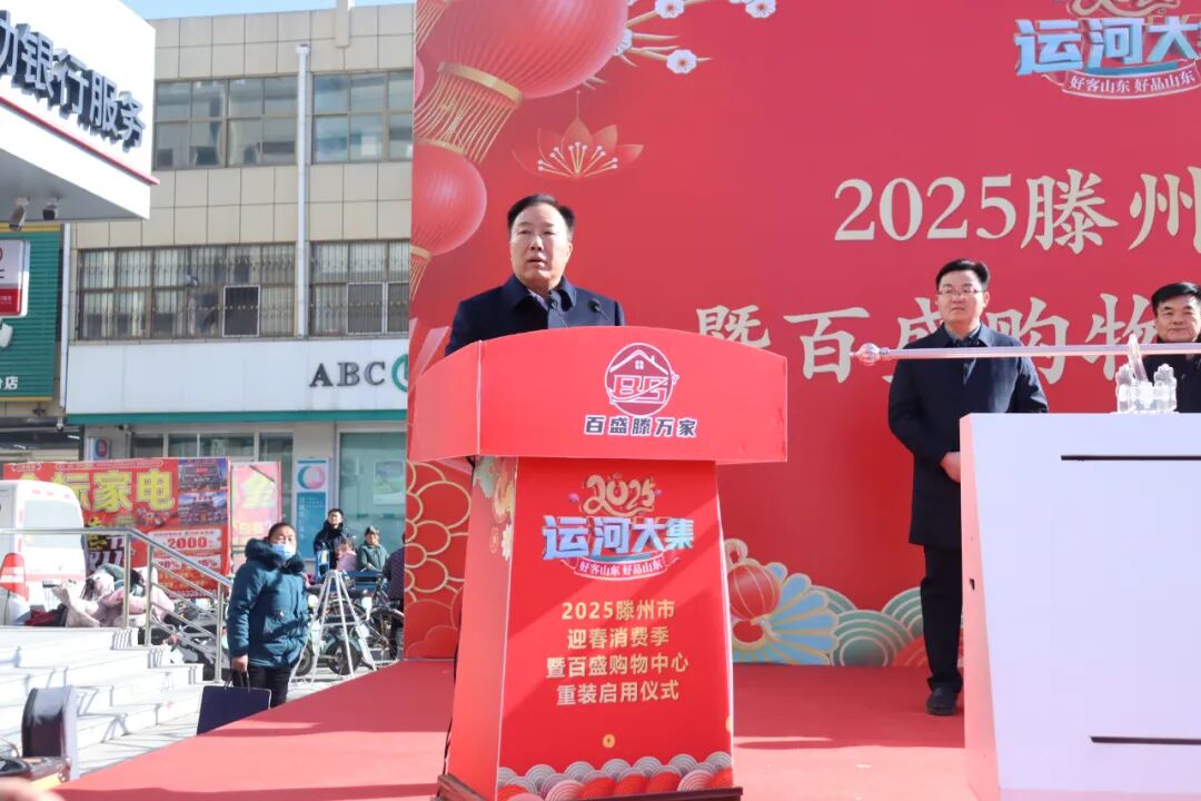 市商务和投资促进局党组书记、局长宗兆波在仪式上讲话。他指出,在刚刚过去的2024年,我们深入贯彻各级关于消费促进的决策部署,持续开展消费品以旧换新行动,培育壮大市场主体,以政策红利激发消费需求。下一步,我们将开展好2025滕州市迎春消费季,持续创新消费场景,大力发展新型消费,以多元业态激发消费活力,更好满足人民群众对美好生活的向往。衷心希望重装后的百盛购物中心借助全市迎春消费季契机,大力推出形式多样的主题活动,更好满足消费者足不出镇就可以办齐“年货”,尽享品质生活的民生需求。