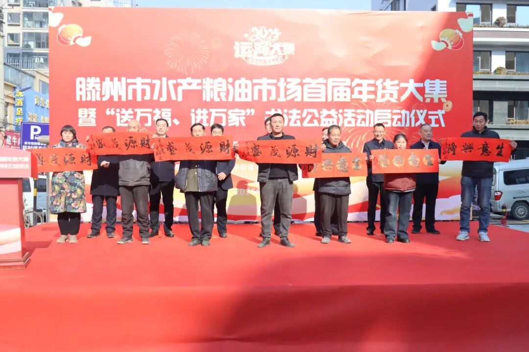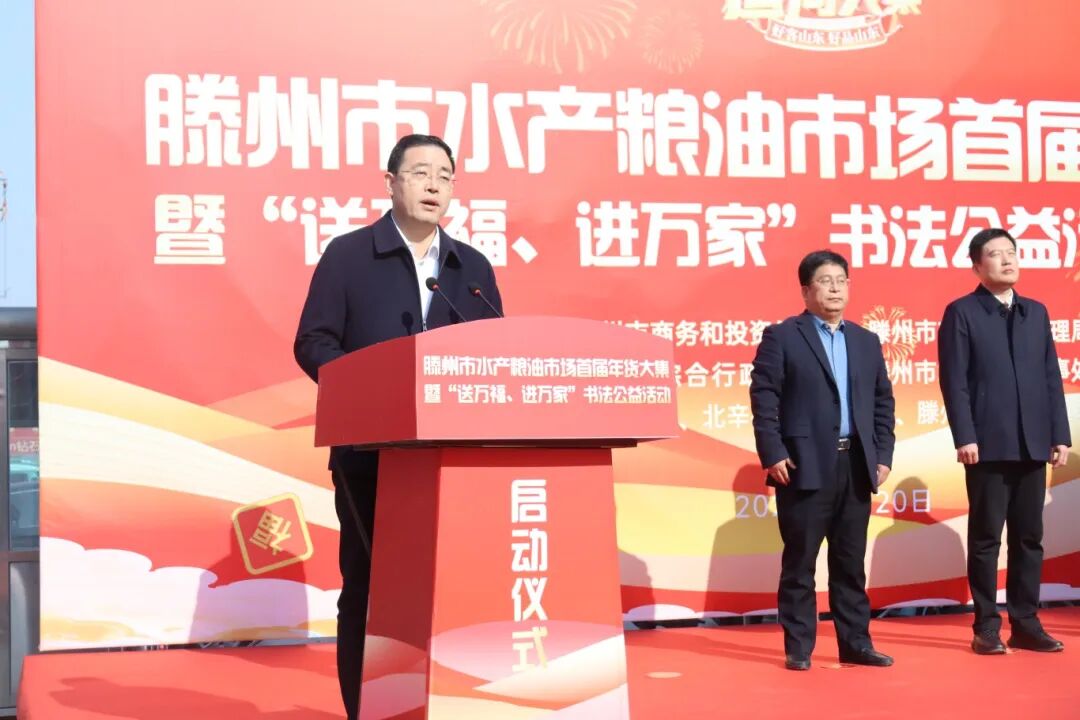 1月20日,滕州市水产粮油市场首届年货大集暨“送万福、进万家”书法公益活动举行。市政府党组成员、副市长徐方坤,市商务和投资促进局党组书记、局长宗兆波,市场监管局党组成员、市综合检验检测中心主任史德庆,市综合行政执法局党组成员、市综合行政执法大队大队长张显峰,北辛街道党工委副书记、办事处主任孔维刚,北辛街道党工委委员、办事处副主任王永,滕州水产粮油市场负责人马军运等出席活动。