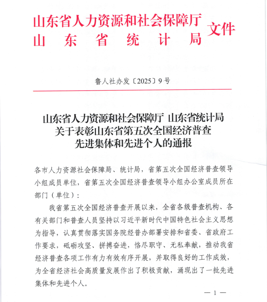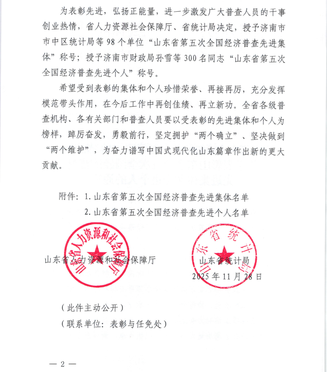 山东省人力资源和社会保障厅、山东省统计局印发了《关于表彰山东省第五次全国经济普查先进集体和先进个人的通报》(鲁人社办发〔2025〕9号),滕州市统计局凭借扎实举措与突出成效,荣获“山东省第五次全国经济普查先进集体”荣誉称号。