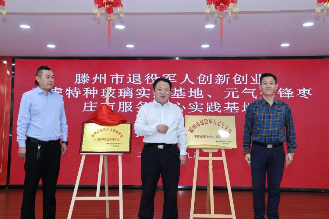 仪式现场暖意融融,退役士兵们身姿挺拔,胸前佩戴的红色绶带格外醒目。滕州市退役军人事务局党组书记、局长赵明殿在致辞中,向光荣返乡、载誉归来的退役士兵们表示热烈祝贺和诚挚欢迎,并结合自身转业经历与人生感悟,与大家真情交流。他鼓励退役士兵们“不忘初心、牢记使命,脱下军装、留下军风,摘下军帽、留下军神”,希望大家尽快适应新环境、融入新生活,将部队锤炼的勇于奉献、敢于担当的优良作风带到地方发展中,在新的人生赛道上续写精彩篇章。随后,赵明殿局长为“滕州市退役军人创新创业正虎特种玻璃实践基地”与“滕州市退役军人元气先锋枣庄服务中心实践基地”揭牌。实践基地的成立将成为退役军人技能提升的“加油站”、角色转型的“桥梁”,助力更多战友们在新的岗位上再创佳绩、续写辉煌!