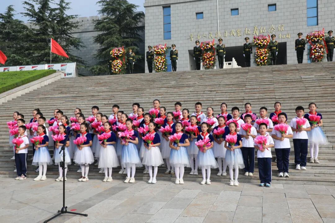 “我们是共产主义接班人……”佩戴红领巾的少先队员手捧鲜花深情献唱《我们是共产主义接班人》,表达继承革命先辈光荣传统、踏着烈士足迹前进的远大志向。