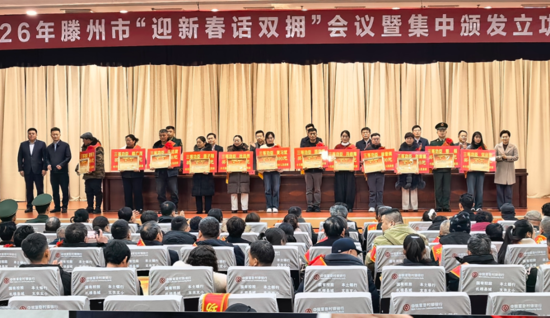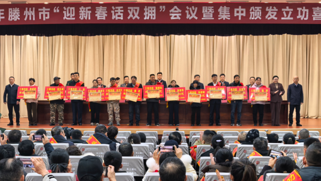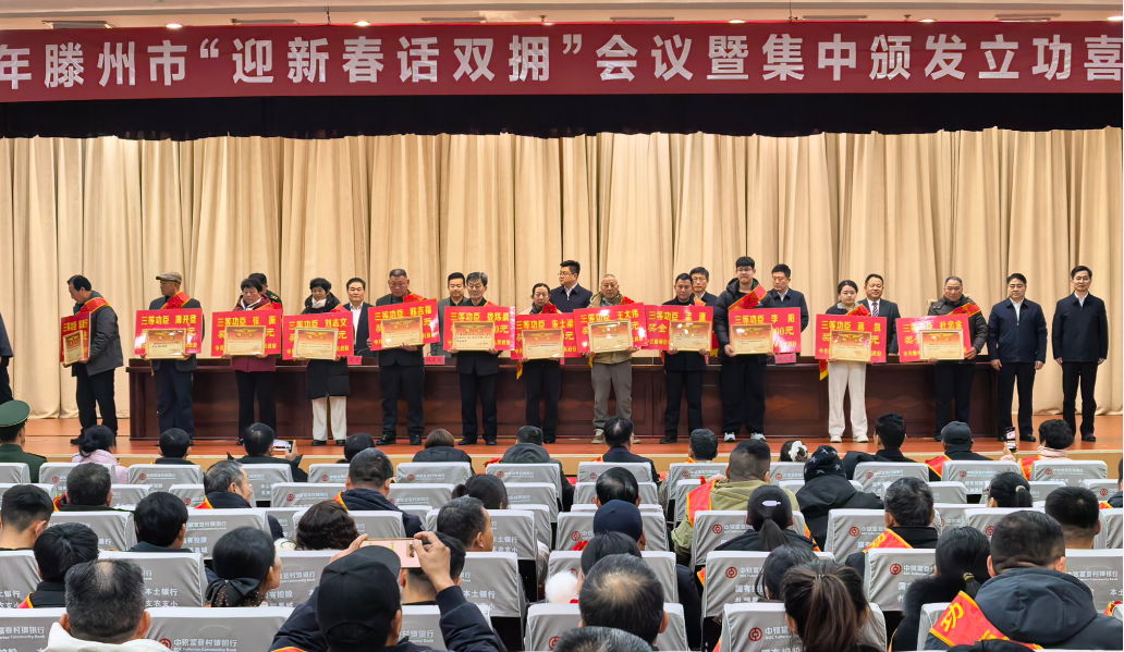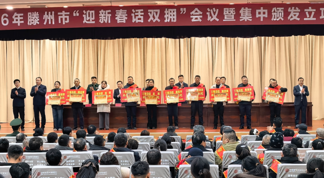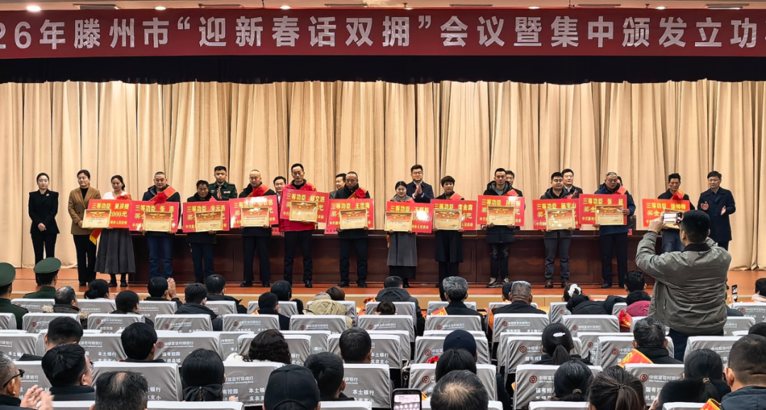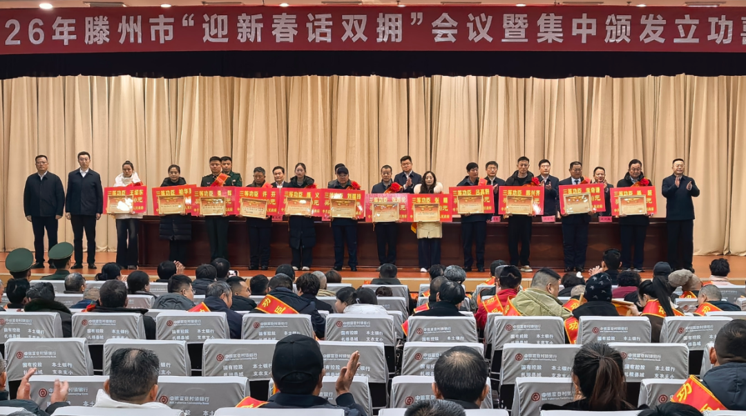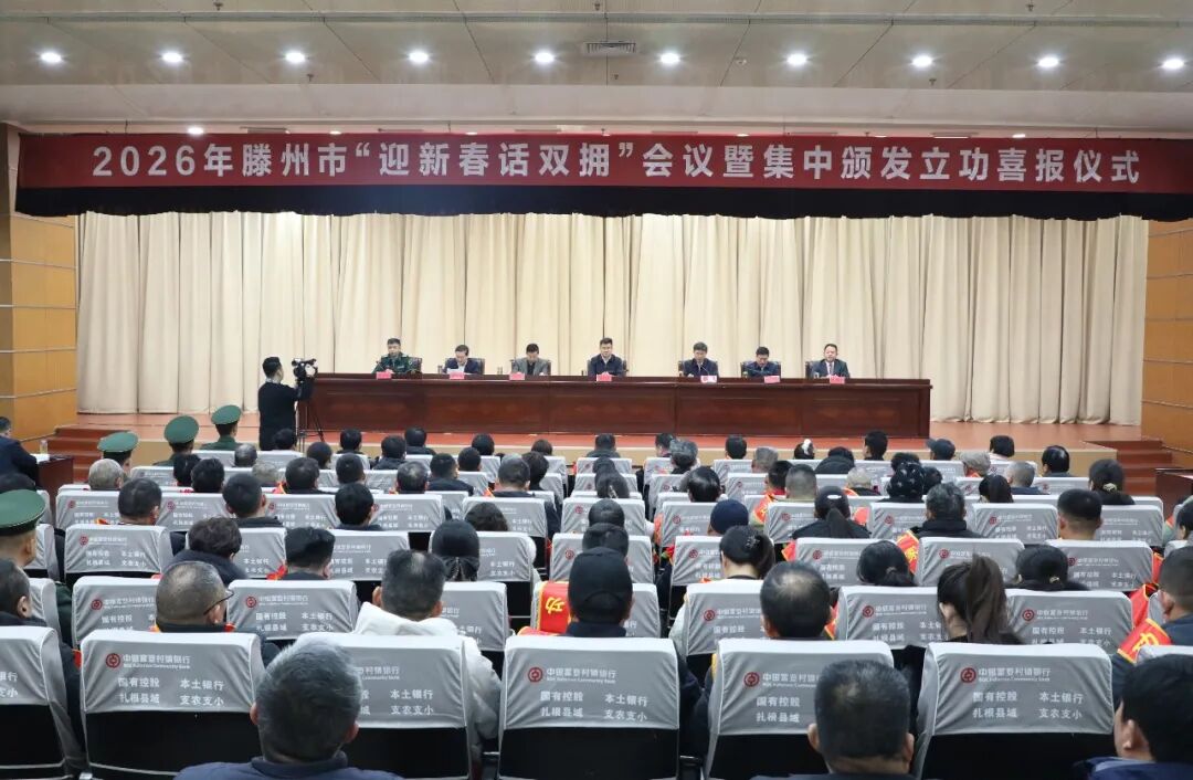 2月2日,2026年滕州市“迎新春话双拥”会议暨集中颁发立功喜报仪式举行,全面总结2025年度我市双拥工作成效,深入分析当前争创全国双拥模范城面临的形势与任务,安排部署下一阶段重点工作,表彰先进、鼓舞士气,进一步凝聚全市上下军民同心、团结奋进的强大合力。市委副书记、统战部部长程亮,市委常委、政法委书记孔祥东,市人大常委会副主任杜孝玺,副市长徐方坤,市政协副主席黄玉传出席会议,市双拥工作领导小组成员单位分管领导,相关镇街主要领导、分管领导和服务站站长,以及驻滕部队、立功现役军人、军属、模范退役军人、兵支书、军创企业和拥军模范企业等各界代表260余人参加会议。