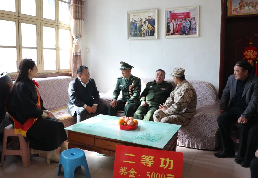 锣鼓喧天,鞭炮齐鸣,醒目的“二等功臣之家”牌匾吸引了不少乡亲们驻足围观。慰问组一行来到刘士柱家中,为其和家属佩戴绶带、送上立功喜报和奖励金,感谢军属为国家和部队培养了优秀人才,希望他们继续做好军人的坚强后盾,一如既往地支持国防建设,让军人在部队安心服役,争取再立新功。刘士柱父母脸上洋溢着幸福的笑容,对党和政府给予的关怀表示感谢。