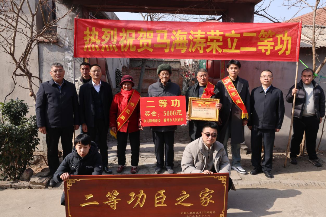光荣喜报送家门,军人军属共荣光。为进一步弘扬拥军优属优良传统,营造浓厚双拥氛围,2月13日,滕州市退役军人事务局党组成员、副局长姜传东,市武装部干事姜润宏,为滨湖镇现役军人马海涛及其家属送去喜报、“二等功臣之家”牌匾和奖金。滨湖镇经济发展办公室副主任李克龙、相关部门负责人陪同。