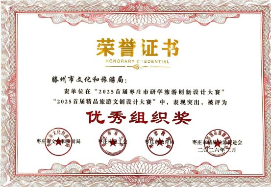 本次大赛旨在以赛促创、以创促产,挖掘枣庄各地研学旅游资源潜力,激发旅游文创设计创新活力,推动全市文旅产业融合高质量发展。经评选,全市共有12家单位获优秀组织奖,滕州两家单位上榜,成为本次大赛的一大亮点。
