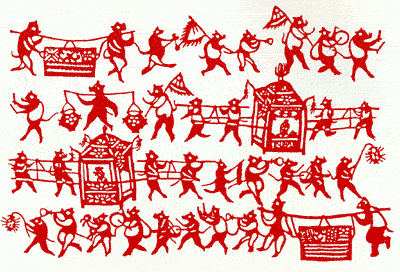 “老鼠嫁女”、“老鼠娶亲”的年画和剪纸在我国民间视为“吉祥物”,过年过节时贴在墙上和窗户上。四川绵竹印制的《老鼠嫁女》年画,表现一伙老鼠掮旗打伞,敲锣吹喇叭,抬着花轿迎亲。骑在癞蛤蟆背上的是“新郎”,头戴清朝的官帽,手摇折扇,双目注视着一只大金箱,显出一副贪婪的样子。正当这伙丑类大摇大摆,招摇过市之时,等待它们的却是一头大黄猫。前面鸣锣开道的一对鼠兄鼠弟,其中之一已被猫的利爪抓住,另一只则咬在猫的嘴上。此时,坐在花轿里的“新娘”,自知末日来临、泪流满面。这幅年画反映了人民鲜明的爱憎。