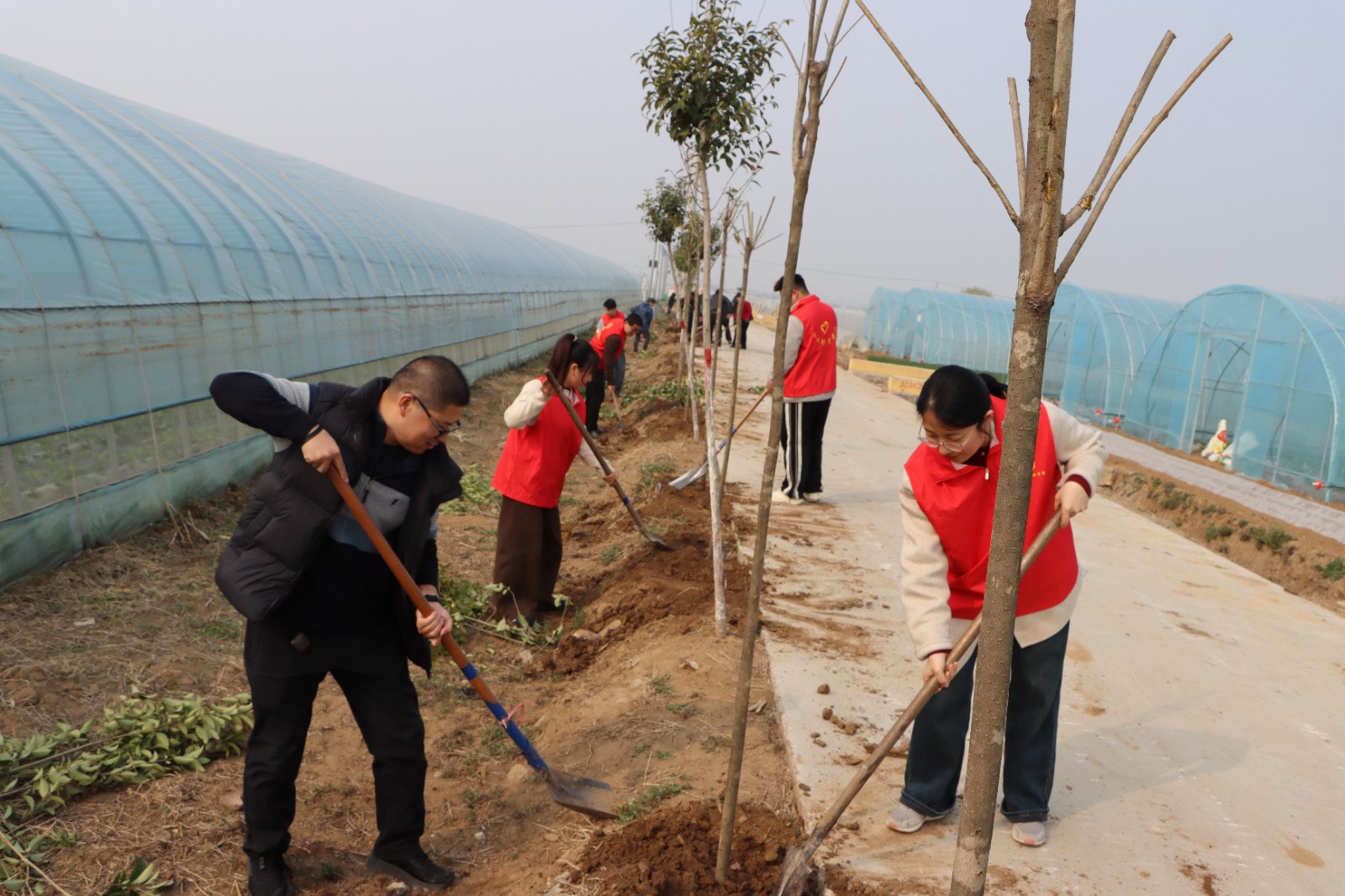 随后,参与人员两两一组、分工协作,挥锹铲土、填坑扶苗、浇水定根,每道环节细致严谨、有条不紊。红色志愿身影穿梭其间,欢声笑语与劳动号子交织,一派热火朝天的生动景象。经过数小时奋战,一排排新栽苗木迎风挺立,为初春的大坞增添了蓬勃生机,此次活动共栽植乡土苗木千余株。