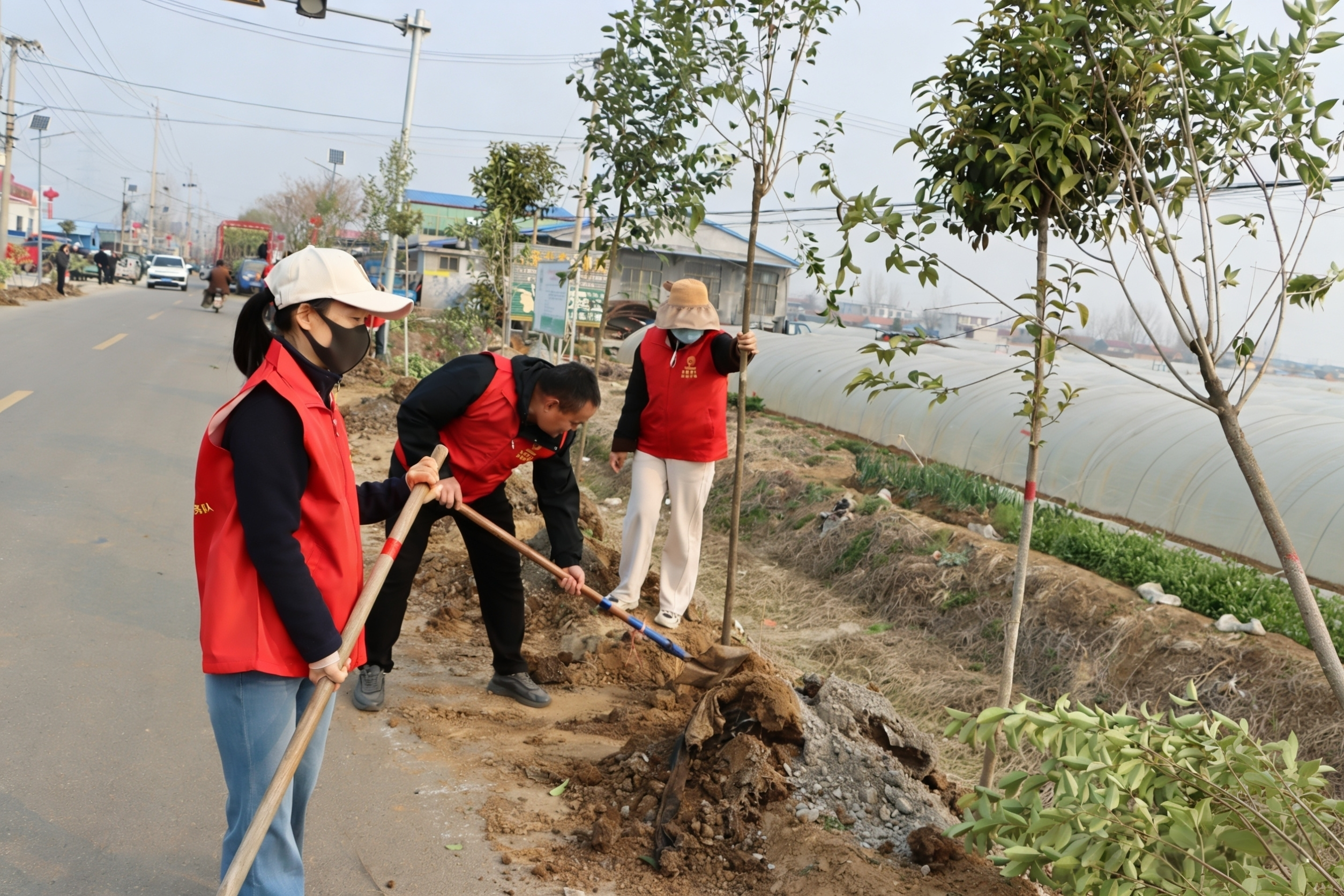 活动现场井然有序、干劲十足,工作人员提前备齐铁锹、水桶、水带及各类苗木,明确栽植区域、规格标准与分工安排。指导人员现场示范挖坑、扶苗、培土、踩实、浇水等关键工序,强调严把树苗质量、栽植尺寸关,要求树坑尺寸达标、苗木扶正稳固、覆土压实到位,确保栽一棵、活一棵、成一片。