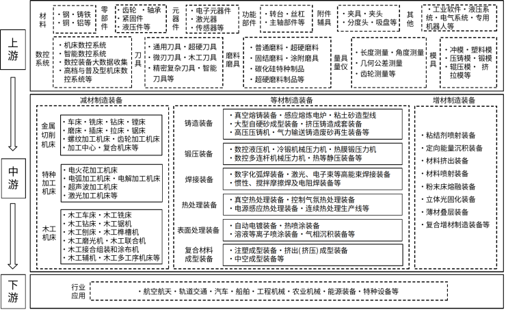 工业母机高质量标准体系基于产业链与标准的映射关系形成。工业母机产业链指以减材制造装备、等材制造装备、增材制造装备为核心,从原材料到终端产品制造及应用的各环节完整链条,产业链上游涵盖配套材料、零部件、功能部件等其他配套产品,下游涵盖航空航天、轨道交通等应用领域。工业母机产业链如图1所示。