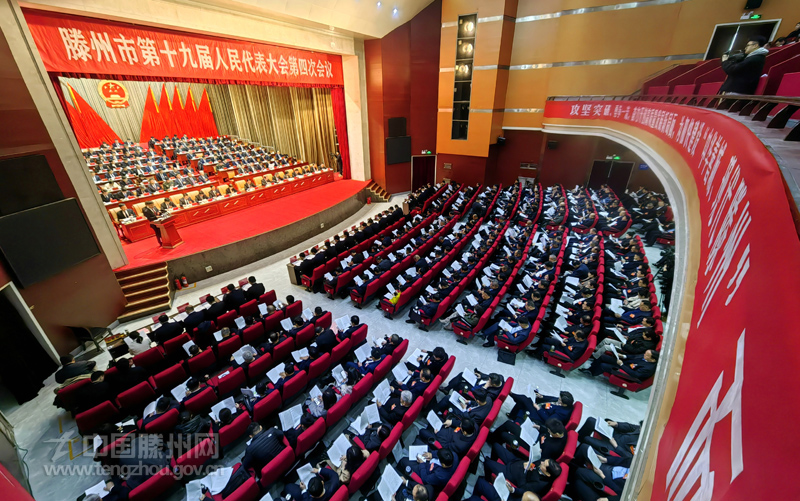 滕州剧院内气氛庄重热烈,主席台帷幕正中的国徽在鲜艳的红旗映衬下熠熠生辉,二楼眺台上“攻坚突破、勇争一流,奋力开创高质量发展新局面,为加快建设‘中华善城、现代滕州’而努力奋斗”的巨型标语格外引人注目。