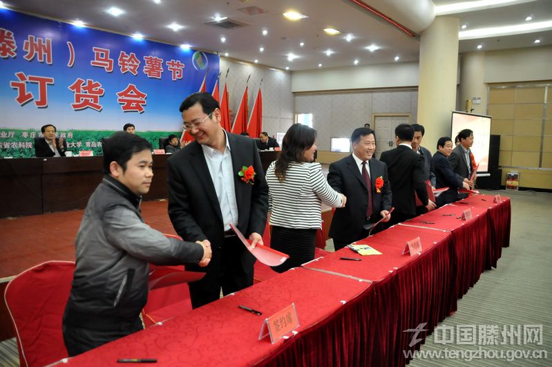 4月13日,作为第五届中国(滕州)马铃薯节主题活动之一的马铃薯订货会在滕州宾馆举行,现场共签订马铃薯订货合同16个,购销数量43.6万吨,合同金额10.4亿元。农业部信息中心副主任杜维成,农业部农业贸易促进中心副主任徐宏源,省农业厅信息中心主任孙文军,以及我市领导邵士官、李广宪、刘涛、王宏岳、孙士泉出席订货会。