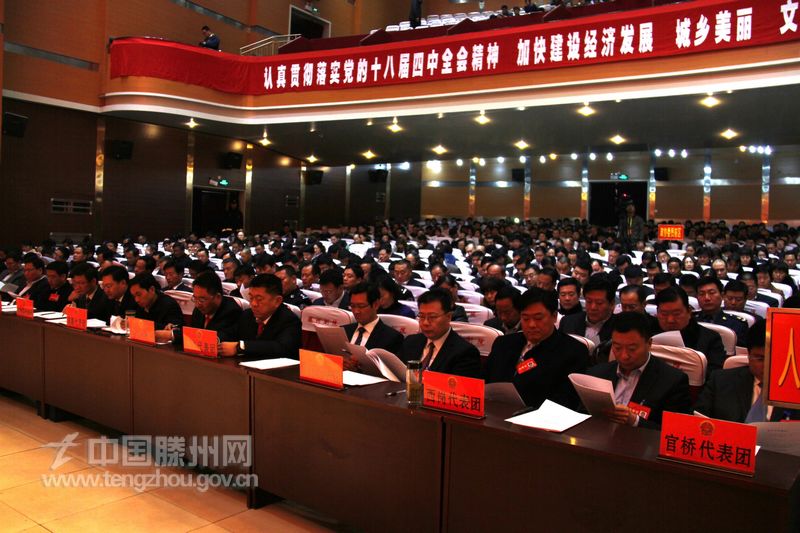 会场内,温暖如春,主席台上国徽高悬,鲜艳的红旗分列两侧,现场气氛庄严热烈。二楼眺台上悬挂的“认真贯彻落实党的十八届四中全会精神,加快建设经济发展、城乡美丽、文化繁荣、社会和谐、政治清明的幸福滕州”的横幅标语格外醒目。会场简朴庄重,参加会议的代表们满怀豪情地步入会场,满脸的笑容,掩不住内心对美好未来的期待和对新常态下经济社会发展的憧憬。