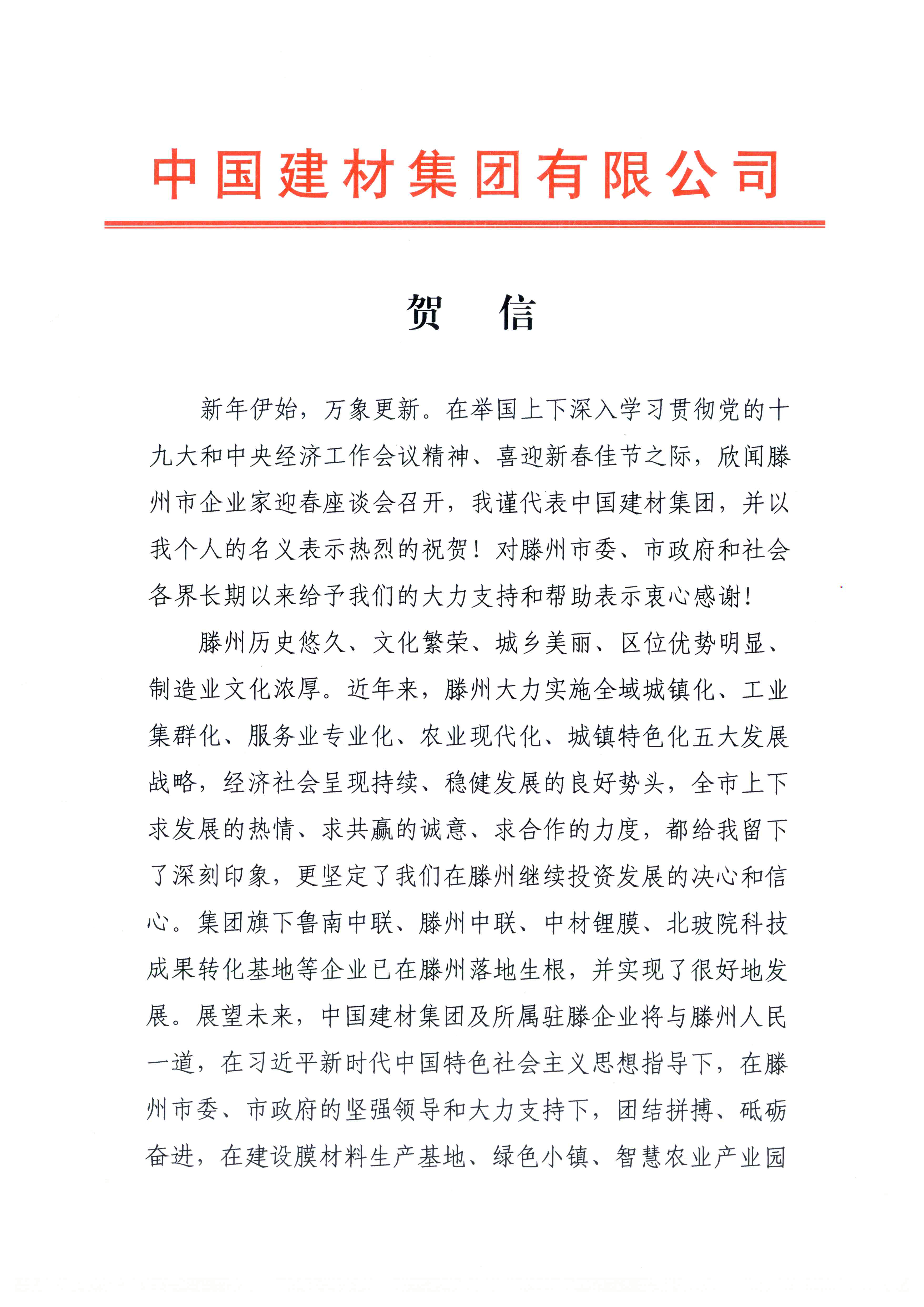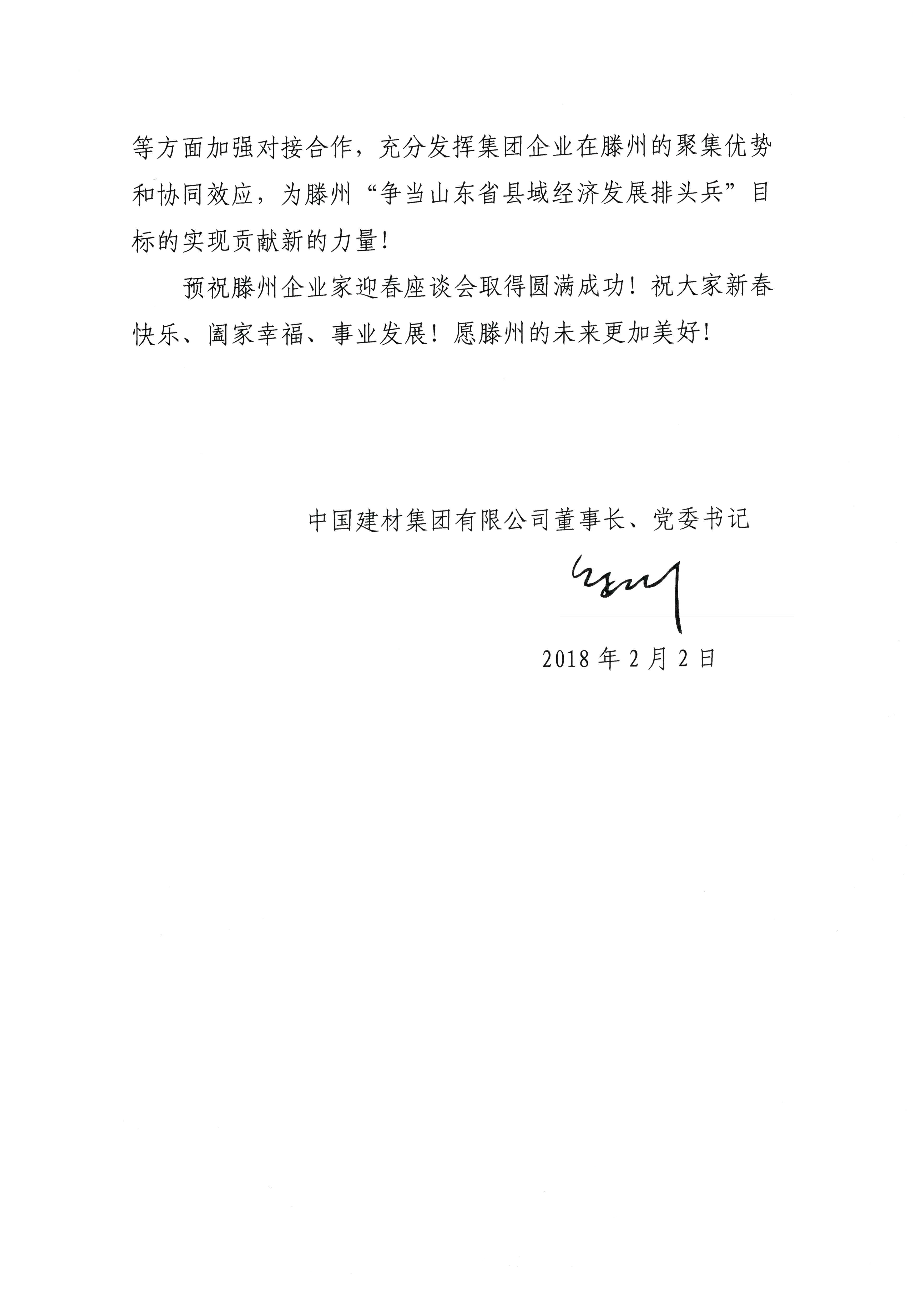 2月3日,滕州市企业家迎春座谈会召开。中国建材集团有限公司董事长、党委书记宋志平致贺信,对会议的召开表示热烈祝贺。贺信全文如下: