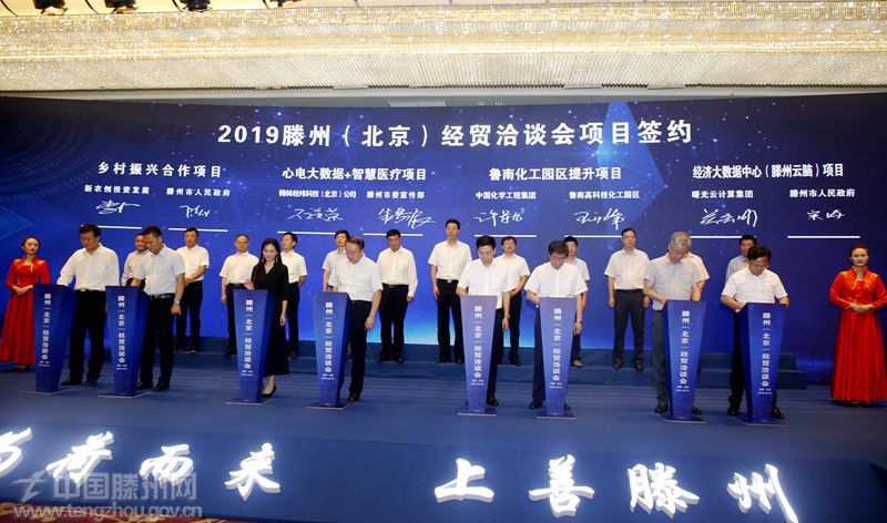 在洽谈会上, 市委副书记、 代市长马宏伟向与会人员介绍了我市经济社会发展及投资环境情况。 在随后举行的签约仪式上, 鲁南高科技化工园区提升项目、 乡村振兴合作项目、 北玻院军品配套生产项目、 心电大数据+智慧医疗项目、经济大数据中心 (滕州云脑) 项目、 微山湖文旅创意园项目、 滨水项目、 华电滕州公司蒸汽管网项目、 国医花海小镇项目、 鲁班田园新城项目、 七星湖九龙湾及秀美荆河治理项目、 凤翔小镇二期安置房项目、 智慧医疗物流供应项目、 北辛工业科技创业园项目、 谷翠峰茶业小镇项目、 轨道交通安全项目、 诚德康复医院项目、 医养结合 (养老服务中心) 项目、 环保过滤膜项目、 生产建筑模板项目、 制镜玻璃及配套装备项目、 西岗镇医养结合项目、 海鑫国际物流园项目、 外贸清真食品研发生产项目等24个项目成功签约, 洽谈会取得圆满成功。