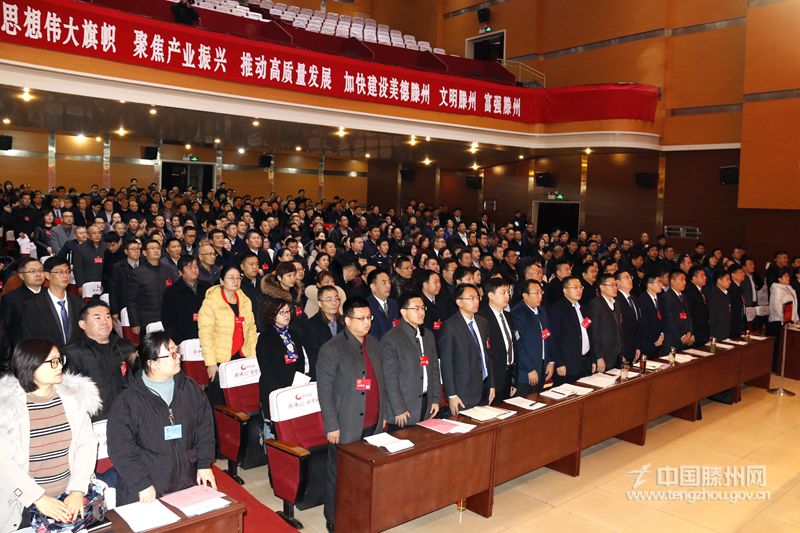滕州剧院内气氛庄重热烈,主席台后侧幕布正中,悬挂着中国人民政治协商会议的会徽,十面鲜艳的红旗,分立两边。主席台正对面悬挂着“高举习近平新时代中国特色社会主义思想伟大旗帜 聚焦产业振兴 推动高质量发展 加快建设美德滕州文明滕州富强滕州”的巨幅标语,格外鼓舞人心。