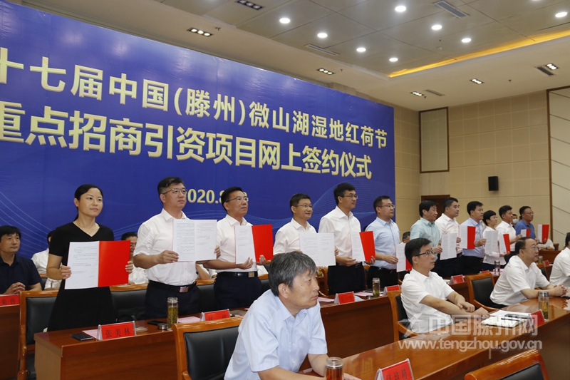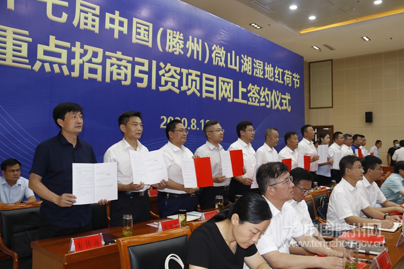 8月18日,第十七届中国(滕州)微山湖湿地红荷节重点招商引资项目网上签约仪式举行。市领导刘文强、马宏伟、李健、宗大全、苏学锋、朱晏辰、薛登峰、王涛、康凤霞、樊猛出席签约仪式。