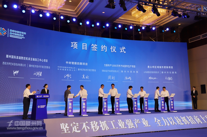 5月24日,我市举行招商引资集中签约仪式,12个招商引资项目成功签约。枣庄、滕州两级市领导张宏伟、翟军、邵士官、赵刚、王广部、朱国伟、张德琦、李玉森、周刚、朱晏辰、王涛等出席。西班牙伊巴米亚机床中国区总经理荣屹航,山东能源集团有限公司财务总监杨再昌,上海交大智邦科技有限公司董事长凌卫国,中关村新型电池技术创新联盟秘书长、电池百人会理事长于清教,腾龙精线集团董事长陈佩君,中材科技股份有限公司总裁助理、中材锂膜有限公司党委书记、董事长白耀宗,博科控股集团有限公司创始人、董事长甘宜梧等企业相关负责人参加活动。