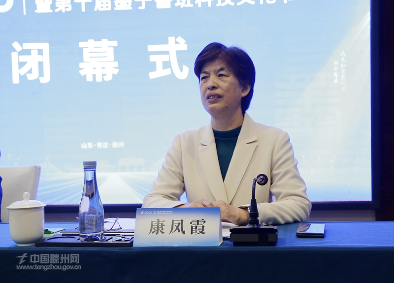 康凤霞在会上讲话。她说,本次研讨会群贤毕至、高朋满座,研讨会紧扣时代脉搏,聚焦“四大全球倡议”的宏观视野,以及人工智能、科技伦理、清廉思想等方向,形成了一批具有前瞻性、建设性的学术成果,主题鲜明,成果丰硕。滕州作为“科圣”墨子、“工匠祖师”鲁班的诞生地和古代科技、创新思想的重要策源地,将深度挖掘、传承、弘扬墨子鲁班文化,坚持“以文会友”,持续与中国墨子学会、山东大学拓展合作成果建立广泛友好的合作关系,推动墨子鲁班文化实现创造性转化、创新性发展。坚持“以文润城”,统筹墨子科技文化城4A级景区和微山湖红荷湿地等人文优势,全力建设县域旅游目的地高质量发展示范区。坚持“以文兴业”,深化与中科院、北航、北理工、山大等高校院所产学研合作,全力引育高等人才,招引落地一批重大引领性项目,为在新的起点上实现滕州经济社会更可持续、更高质量发展提供坚实支撑。