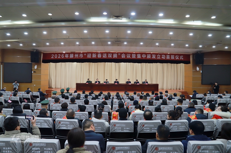 2月2日,2026年滕州市“迎新春话双拥”会议暨集中颁发立功喜报仪式举行,全面总结2025年度我市双拥工作成效,深入分析当前争创全国双拥模范城面临的形势与任务,安排部署下一阶段重点工作,表彰先进、鼓舞士气,进一步凝聚全市上下军民同心、团结奋进的强大合力。市委副书记、统战部部长程亮,市委常委、政法委书记孔祥东,市人大常委会副主任杜孝玺,副市长徐方坤,市政协副主席黄玉传出席会议。