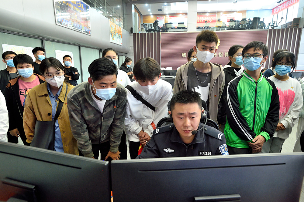 按照“滕州市‘政府开放月’系列活动实施方案”部署要求,我市公安机关积极组织以“警营开放•平安共创”为主题的开放月活动。10月26日下午,枣庄科技职业学院医药卫生学院师生在党总支书记吴业亮、副院长张广鹏的带领下到我局参加“警营开放•平安共创”主题活动。市局党委副书记、政委沈玉升亲自带领学院师生走进市局网警大队、合成作战中心、110指挥中心、图像管理中心。