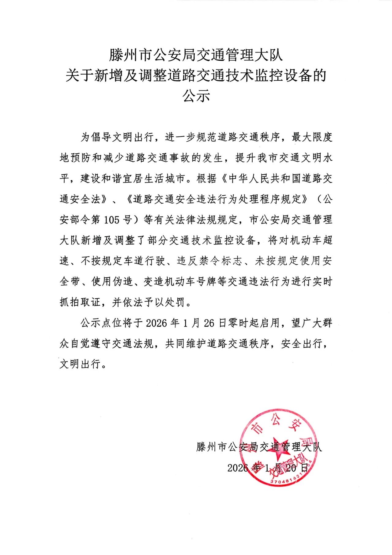 滕州市公安局交通管理大队关于新增及调整道路交通技术监控设备的公示