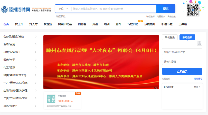 为进一步拓宽就业渠道,帮助各类社会人才和用人单位搭建更广阔的就业服务平台,发挥女性就业指导服务站作用,在滕州人社局、滕州市妇联指导下,聚智人才公司定于4月8日18:00-20:30在滕州市妇女儿童活动中心开展公益性“人才夜市”招聘活动,现将活动情况通知如下。