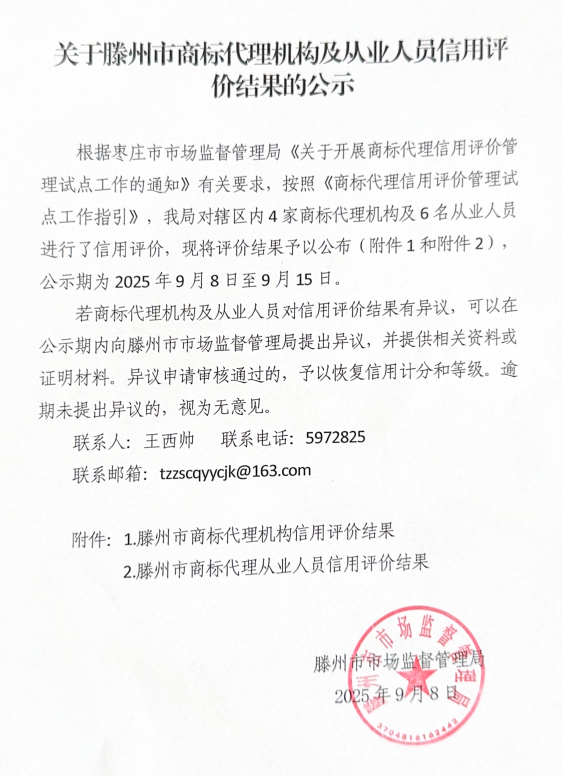 关于滕州市商标代理机构及从业人员信用评价结果的公示