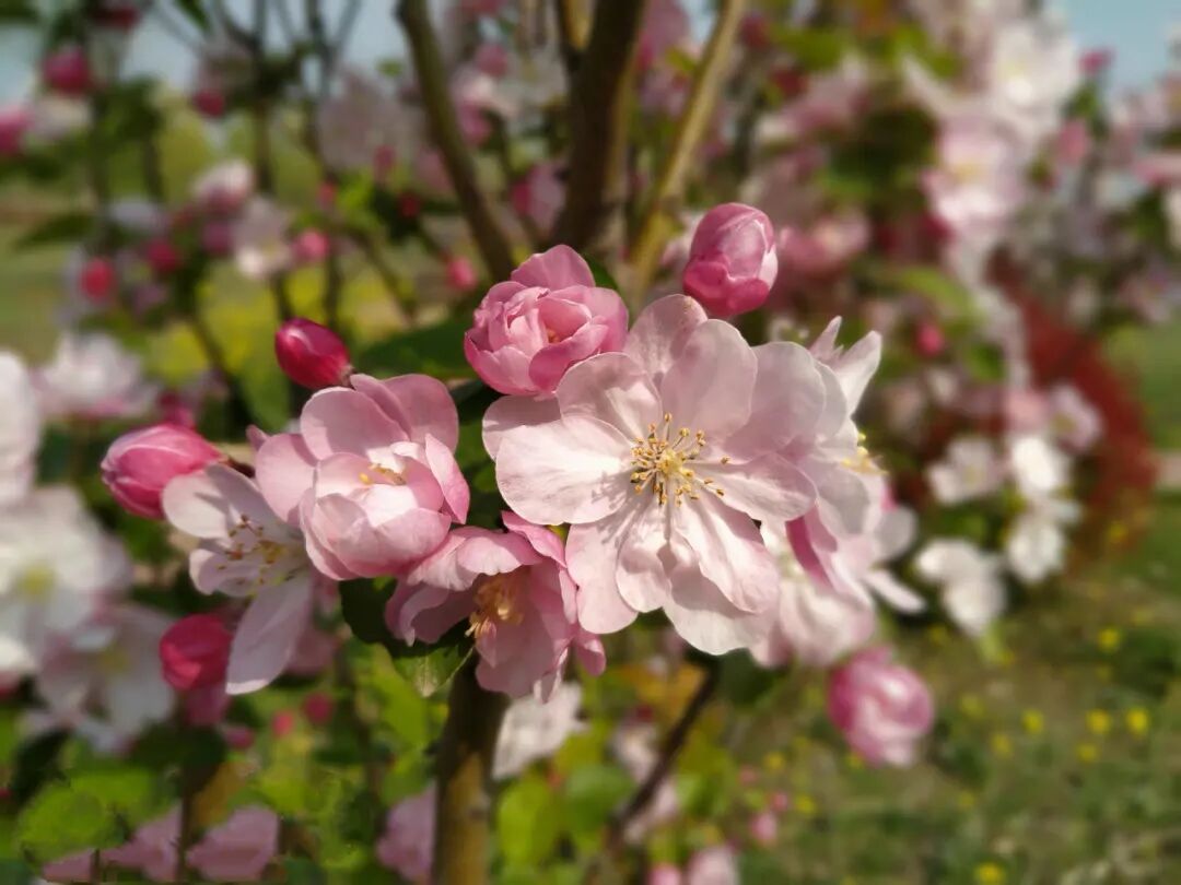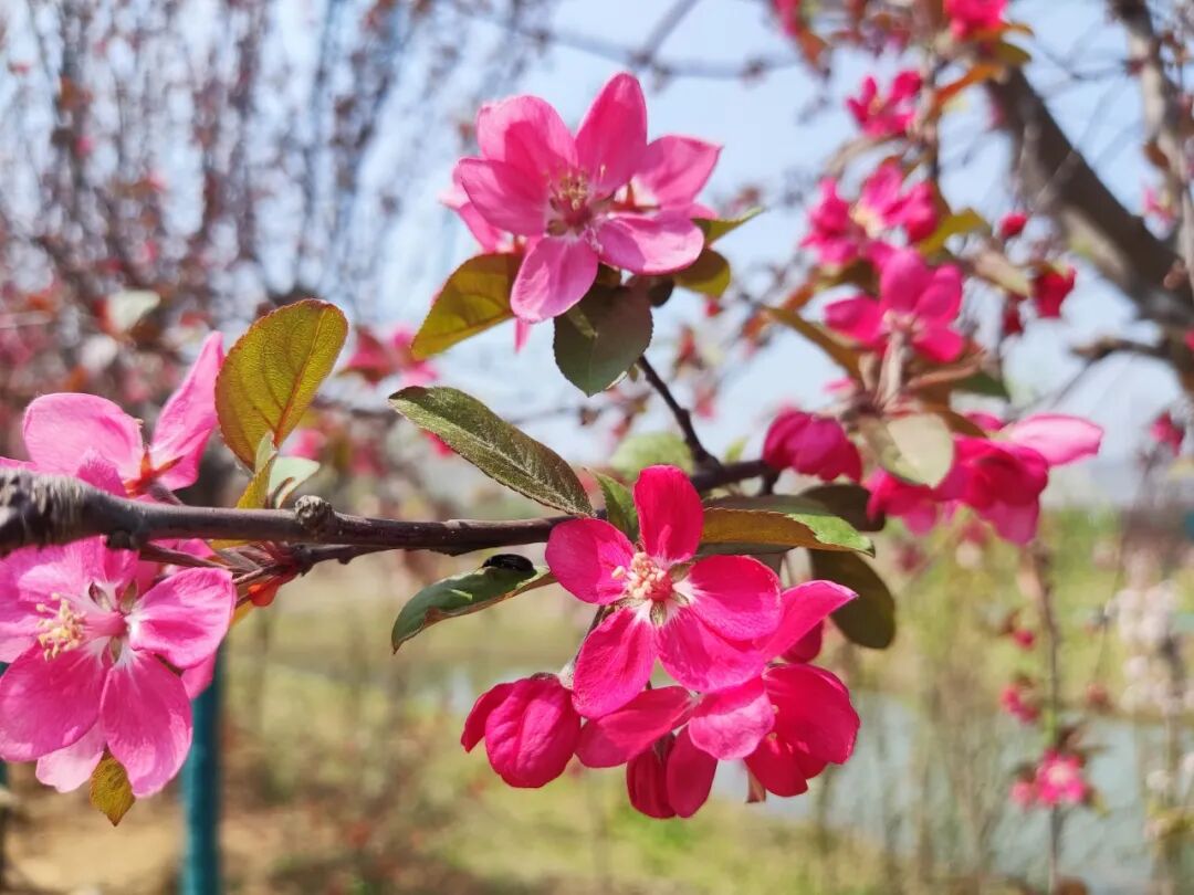 踏入海棠园,瞬间跌进色彩的漩涡!西府海棠粉若烟霞,垂丝海棠柔似锦缎,北美海棠烈如红妆……千株海棠织就花瀑长廊,蜜蜂嗡鸣间,每一步都踩在春天的脉搏上。
