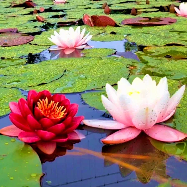 各色“水中仙子”悠然自得地漂浮于碧波之上,晨露如珍珠般在花瓣上轻盈滚落,闪烁着晶莹的光芒。睡莲宛如水中的精灵,静静地守护着这片神秘而美丽的湿地。