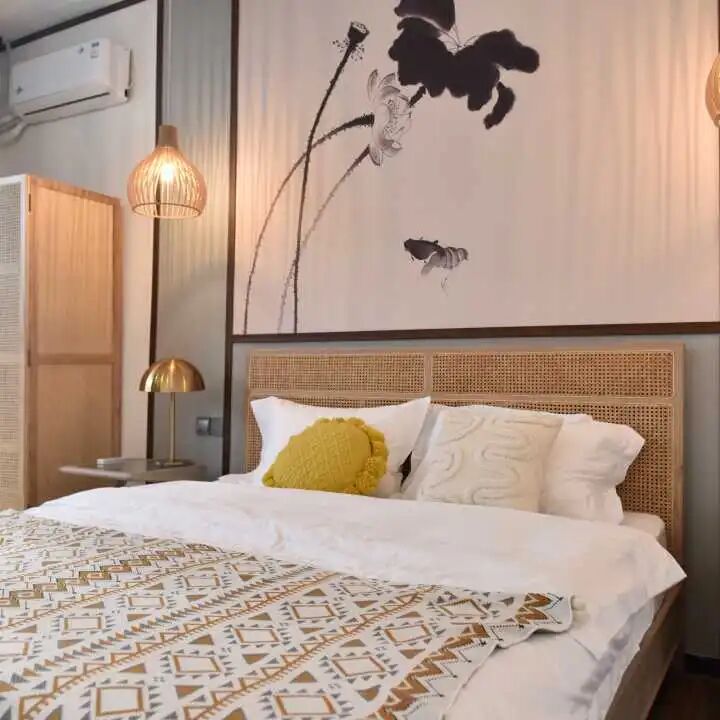 位于西迭湖村内的微湖渔家·荷乡西迭精品民宿,是由村内闲置宅基地和农房改造而成。这里深度融合了微山湖渔家民俗与现代乡村空间美学,打造了13处精品院落,户型涵盖“三室两厅”“两室一厅”等多种类型,风格兼具鲁南民宿底蕴与“微湖渔家”特色。