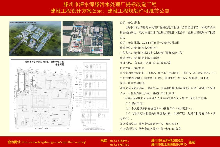 滕州市深水深滕污水处理厂提标改造工程建设工程设计方案公示、建设工程规划许可批前公告
