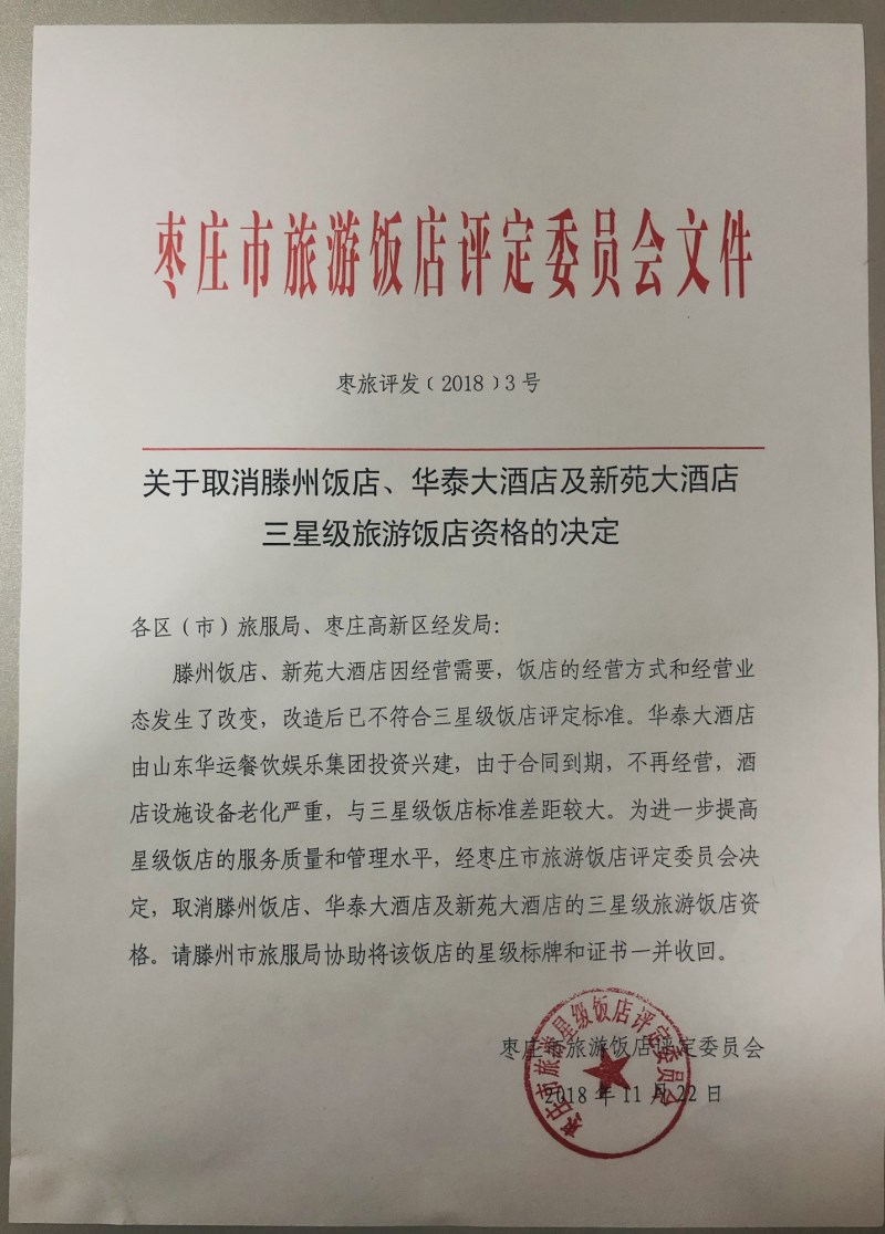 滕州市文化和旅游局转发关于取消滕州饭店、华泰大酒店及新苑大酒店三星级旅游饭店资格的决定