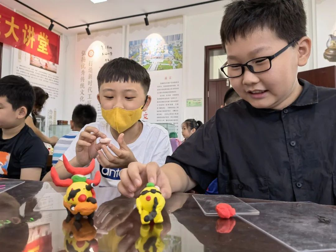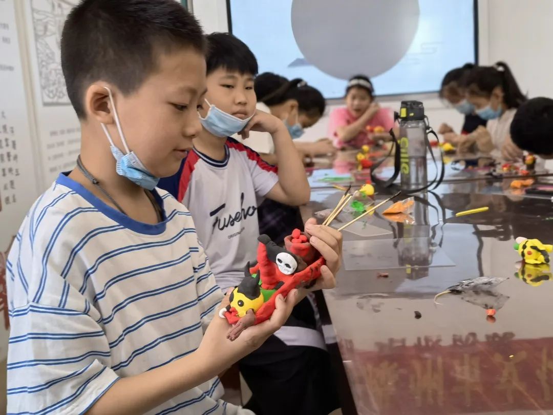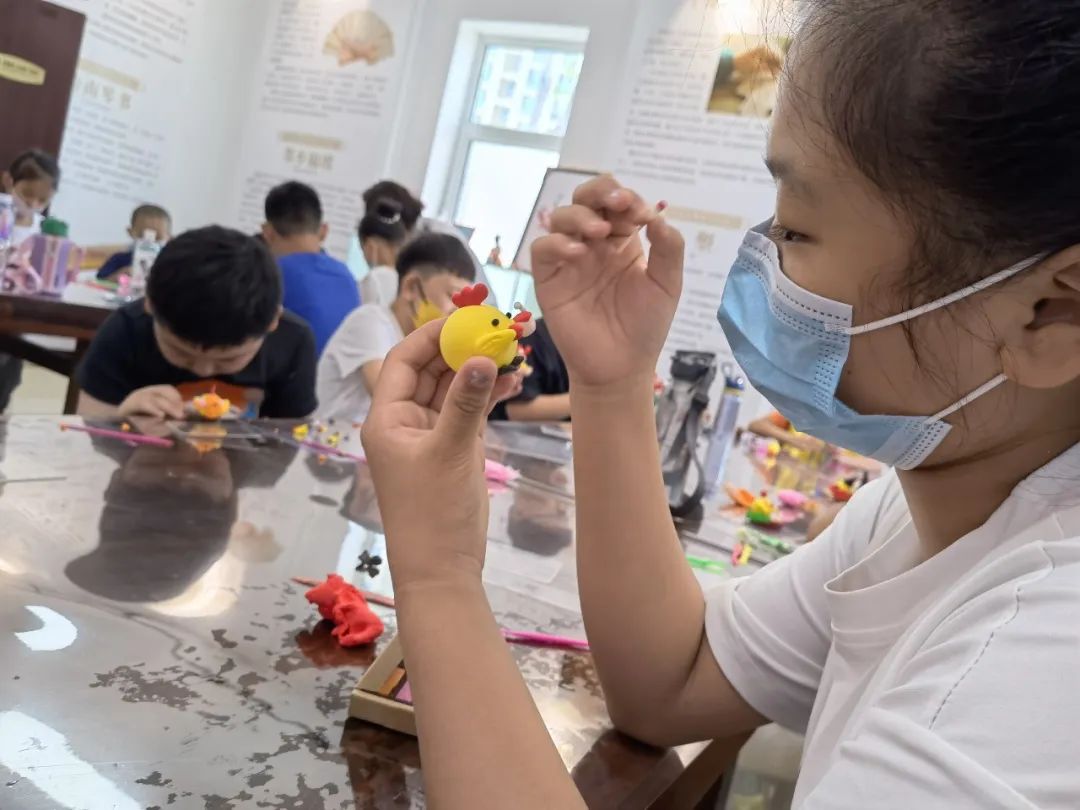 课堂上任老师向孩子们认真讲解了面塑基础知识,耐心解答问题,展示精湛技艺,手把手传授面塑捏制技巧。孩子们学习热情高涨,在倾听、提问和动手中,感知面塑制作的魅力,陆续完成了本期面塑小鸡的形象制作。孩子们的想象力太丰富了,有的给小鸡做了舒服的沙发,有的给小鸡喝上了奶茶,有的给小鸡带上了墨镜骑着摩托抗着枪,有的做出了鸡海盗战船……