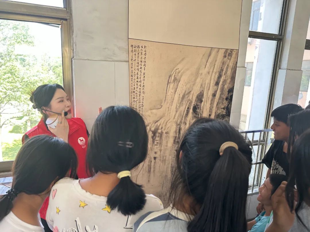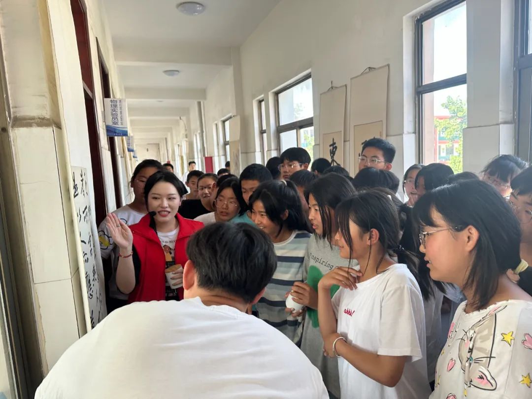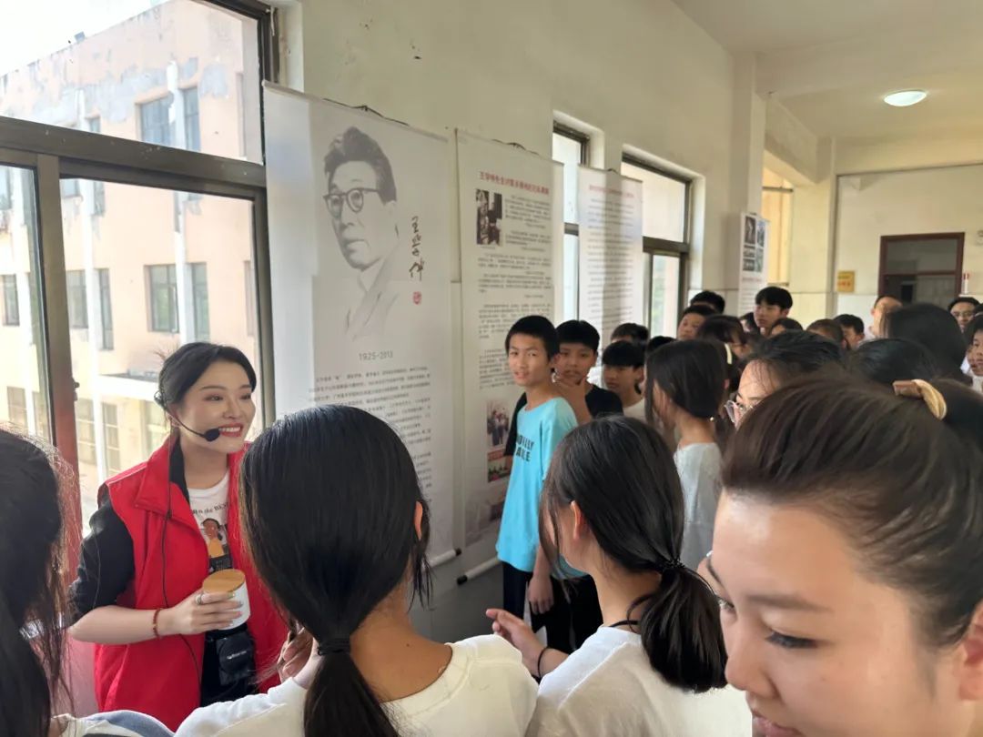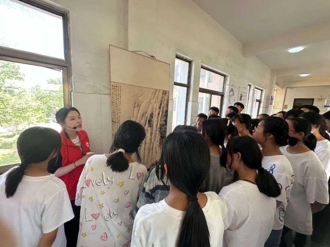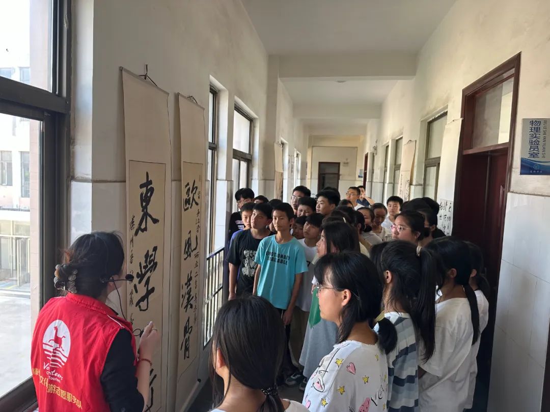滕州市美术馆新时代文明实践“美育进学校”公教活动现场布置在教室的走廊中,吸引了众多师生驻足欣赏。美术馆的公教人员热情地为学生们讲解展览作品,引导学生学习王学仲先生感恩家乡、回报家乡的高尚品德,激励青少年知家乡、爱家乡、建设家乡。在活动讲解期间,围绕此次活动的相关内容与学生们开展问答活动环节,并向回答正确的同学赠送以王学仲人文画为题材的茶叶罐等小礼品,活动现场气氛极为热烈。同时,活动当日滕州市美术馆向官桥中学捐赠美术美学类书籍。