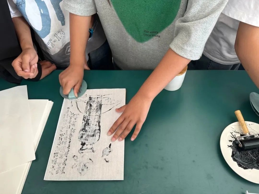 活动还设有木版拓印互动体验环节,社教老师详细地向孩子们讲述木版拓印的历史渊源、制作流程等知识,并让孩子们亲手制作体验印有王学仲先生经典国画《双鲤图》《墨牡丹》的木版画。当“木版”变成了“画”,从孩子们跃跃欲试地表现中,能感受到传统非遗文化带来他们的快乐。