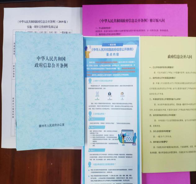 滕州市政府办公室政务公开工作人员为新《条例》宣传活动精心准备了《中华人民共和国政府信息公开条例》修订版八问、政府信息公开六问、一图读懂《中华人民共和国政府信息公开条例》重点内容宣传页及《中华人民共和国政府信息公开条例》(2019版)单行本等宣传资料27000余份。