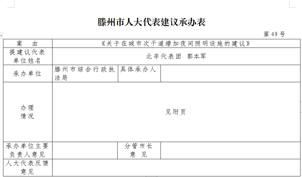 2020年度滕州市综合行政执法局关于人大十八届四次会议第49号代表建议的答复(关于在城市次干道增加夜间照明设施的建议)