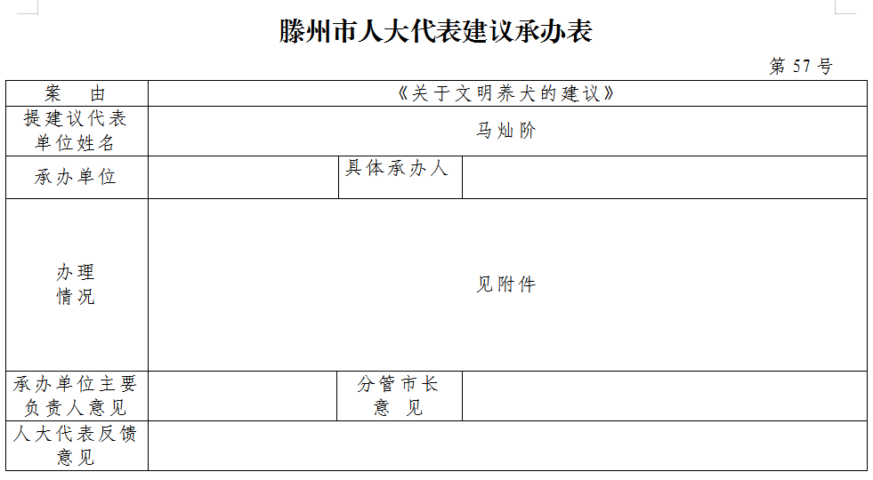 - 标 题:2020年度滕州市综合行政执法局关于人大十八届四次会议第57号代表建议的答复(关于文明养犬的建议)