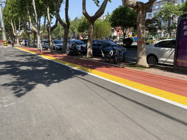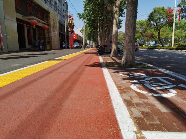 与以往的人行道不同,改造提升后的人行道覆铺了沥青,路面较以往更加平整和坚固耐用。市政工程管理服务中心将人行步道粉刷成红色,与行道树区域的红色透水砖融为一体,并铺设醒目的黄色盲道,红黄拼接的人行步道绚丽夺目,走在路上既舒适又赏心悦目。