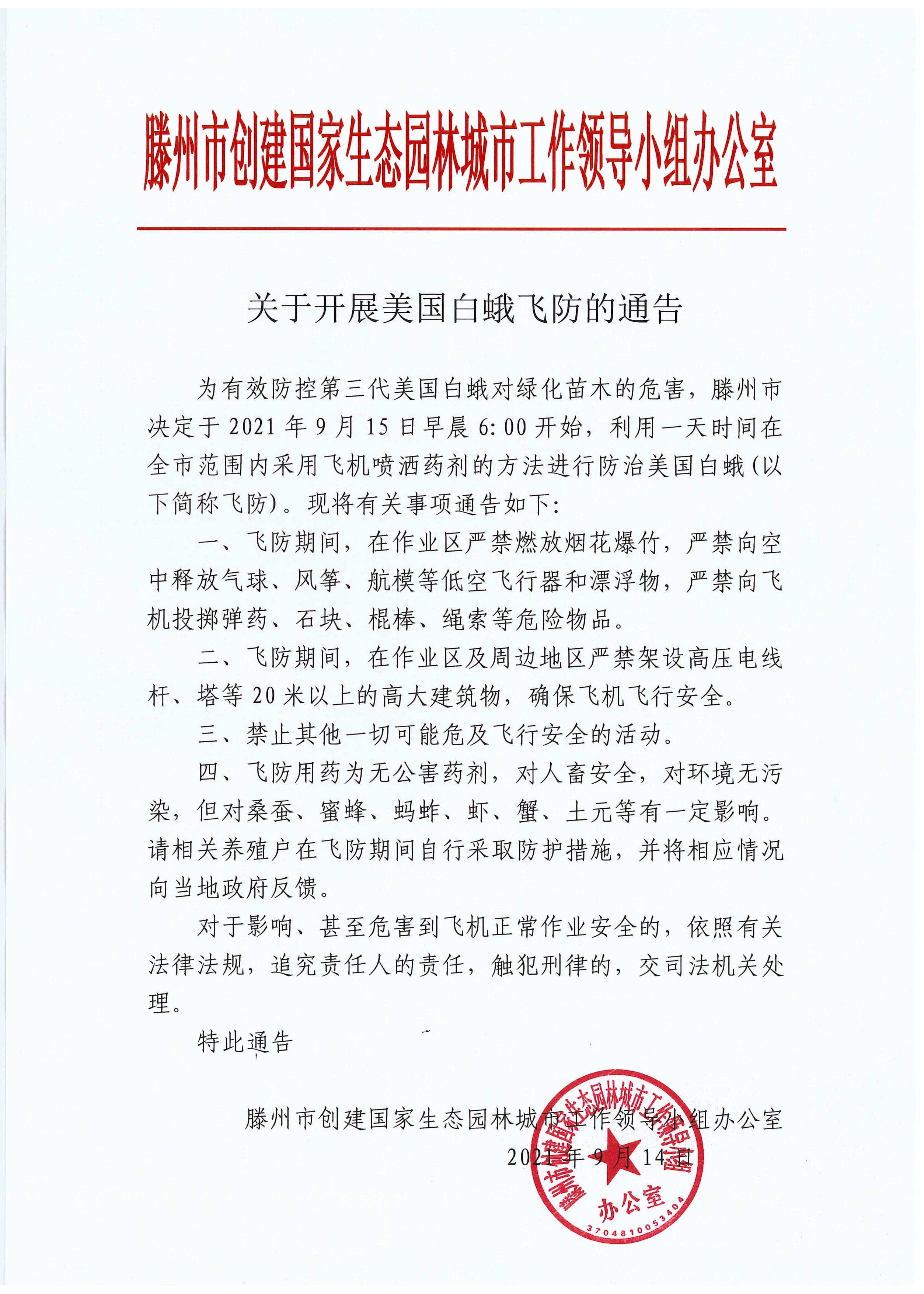 滕州市综合行政执法局转发市创建生态园林城市领导下组办公室《关于开展美国白蛾飞防的通告》