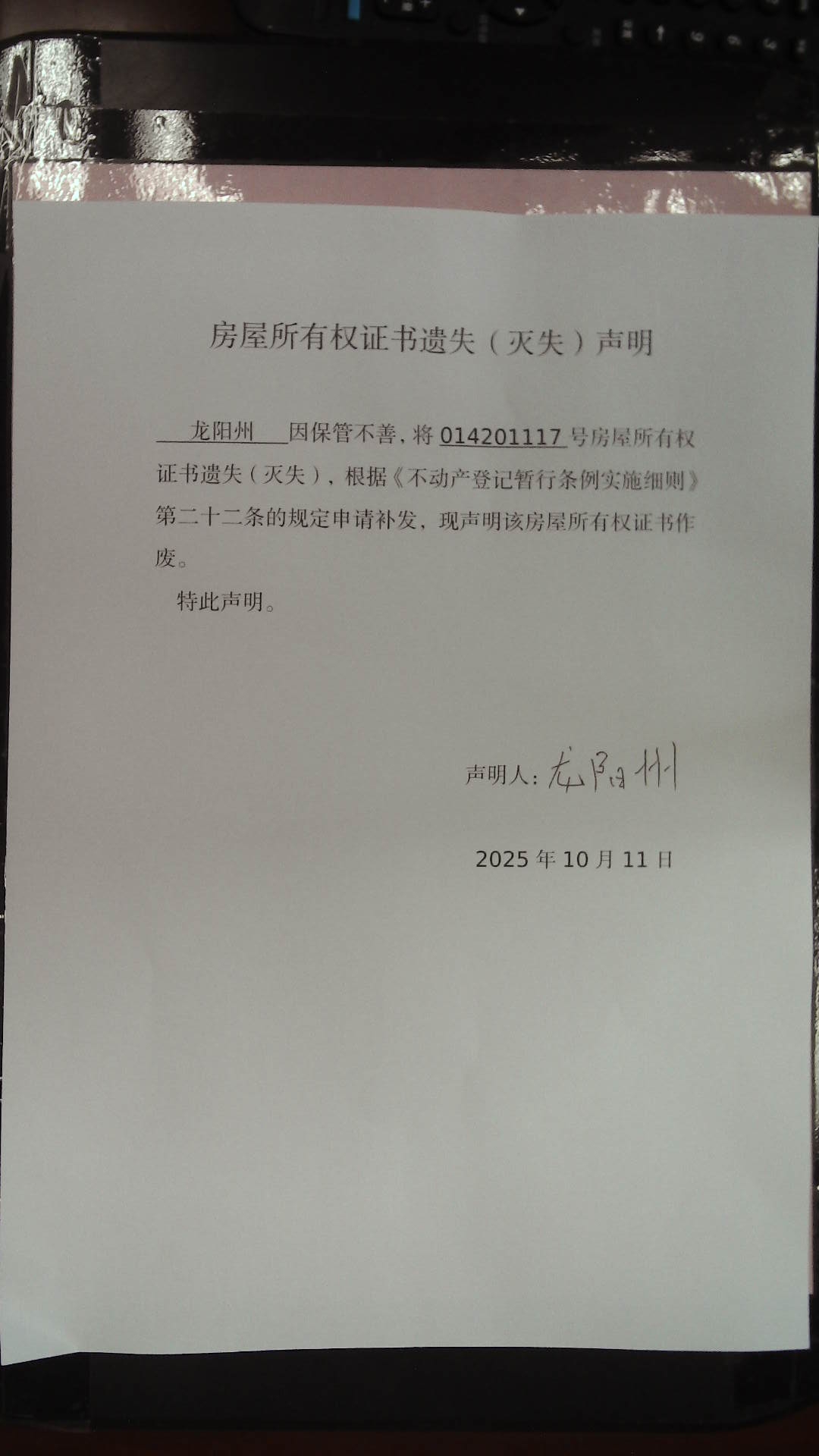 滕州市自然资源局房屋所有权证书遗失(灭失)声明
