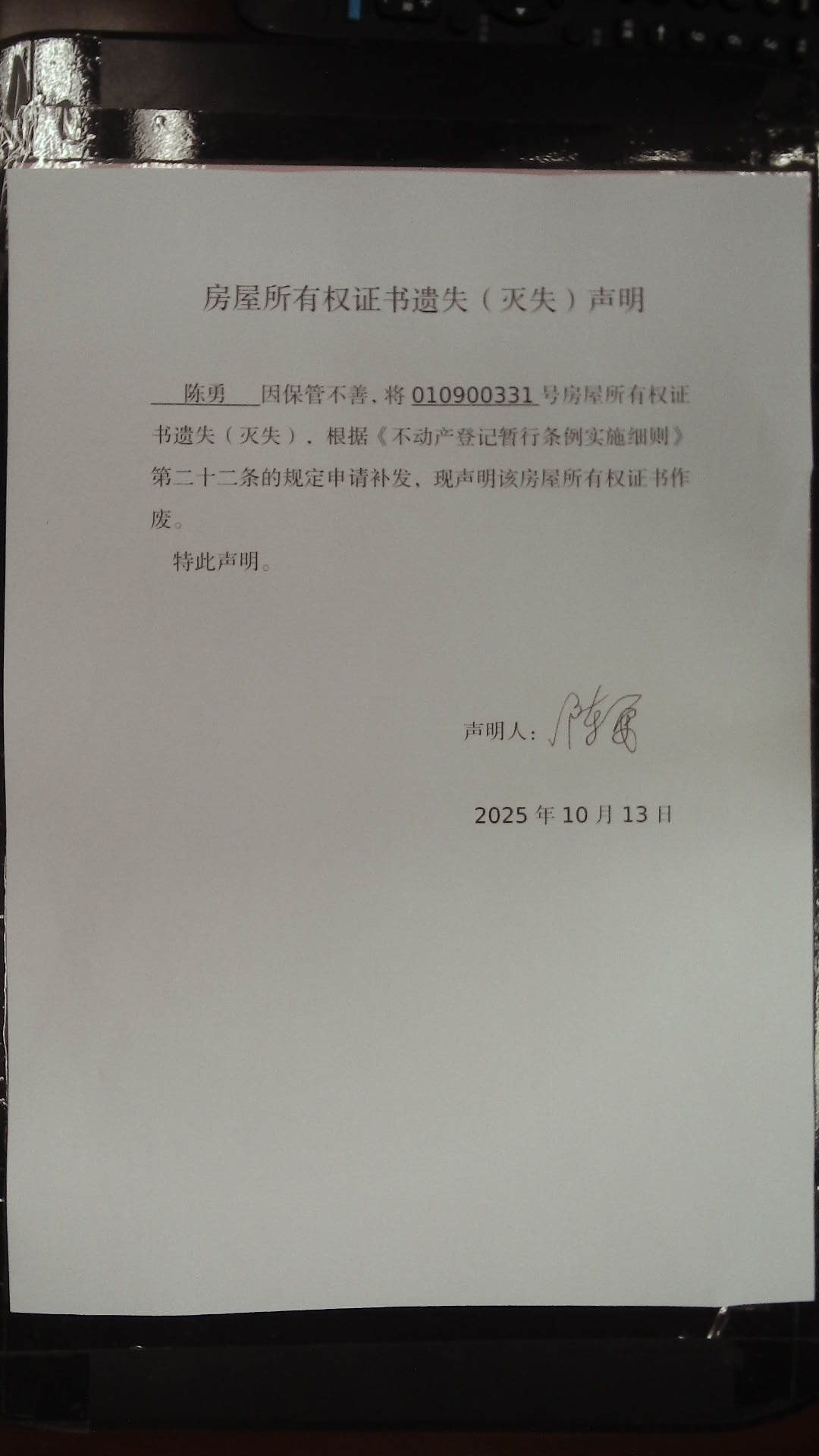 滕州市自然资源局房屋所有权证书遗失(灭失)声明