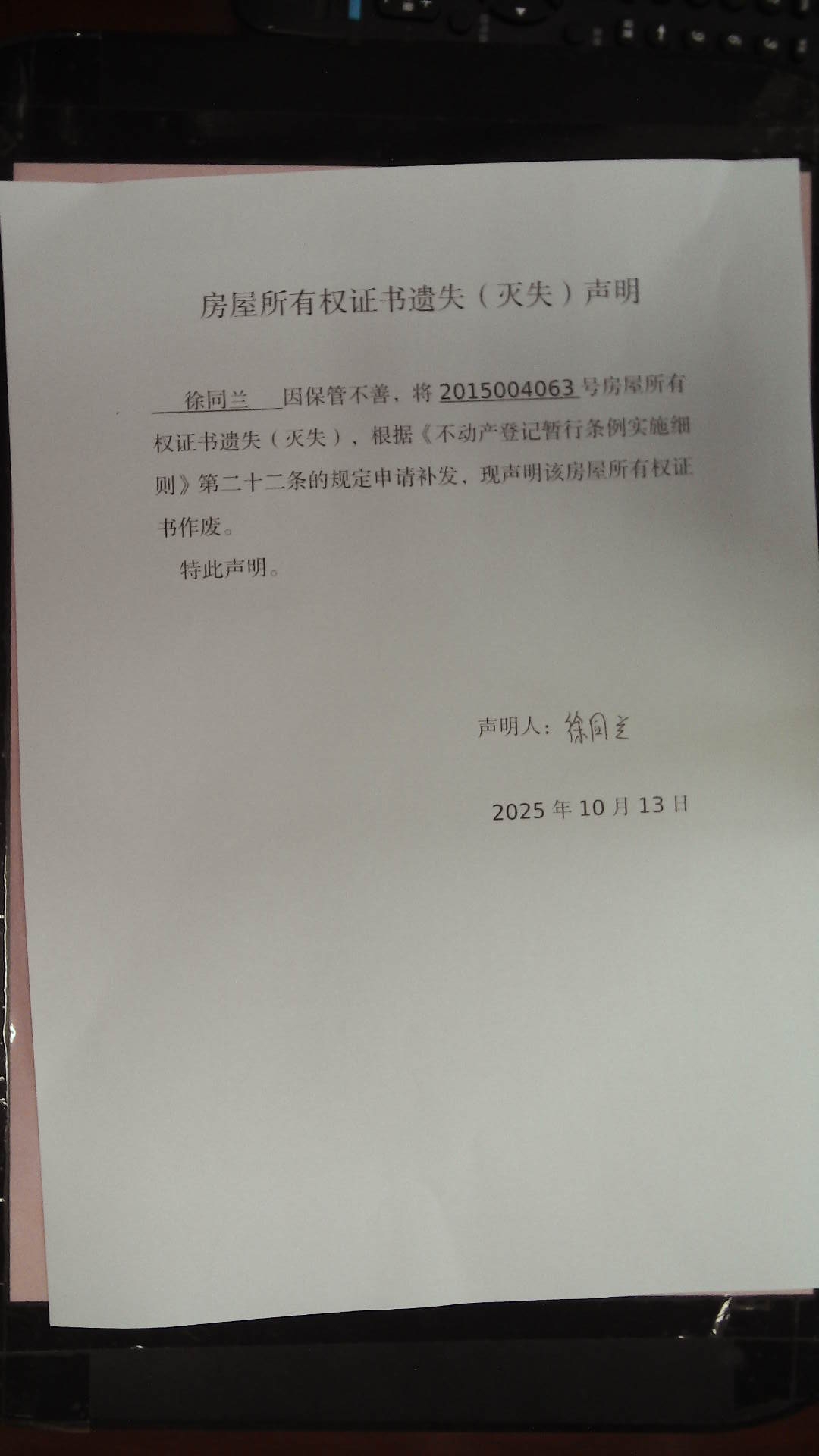 滕州市自然资源局房屋所有权证书遗失(灭失)声明