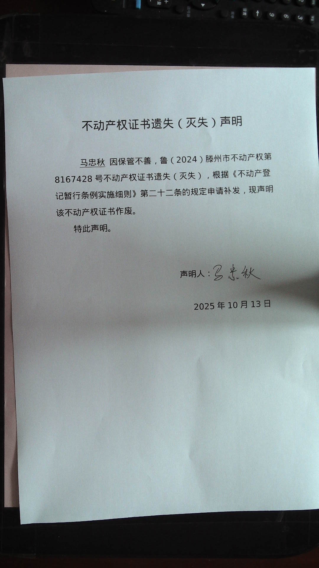 滕州市自然资源局不动产权证书遗失(灭失)声明