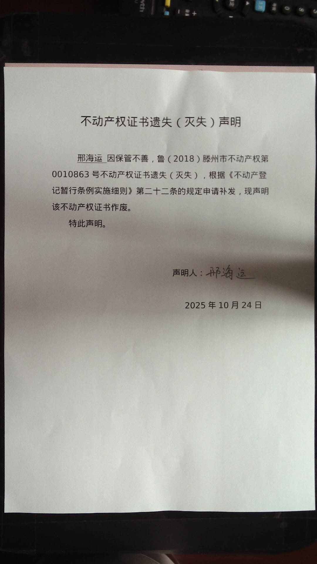 滕州市自然资源局不动产权证书遗失(灭失)声明